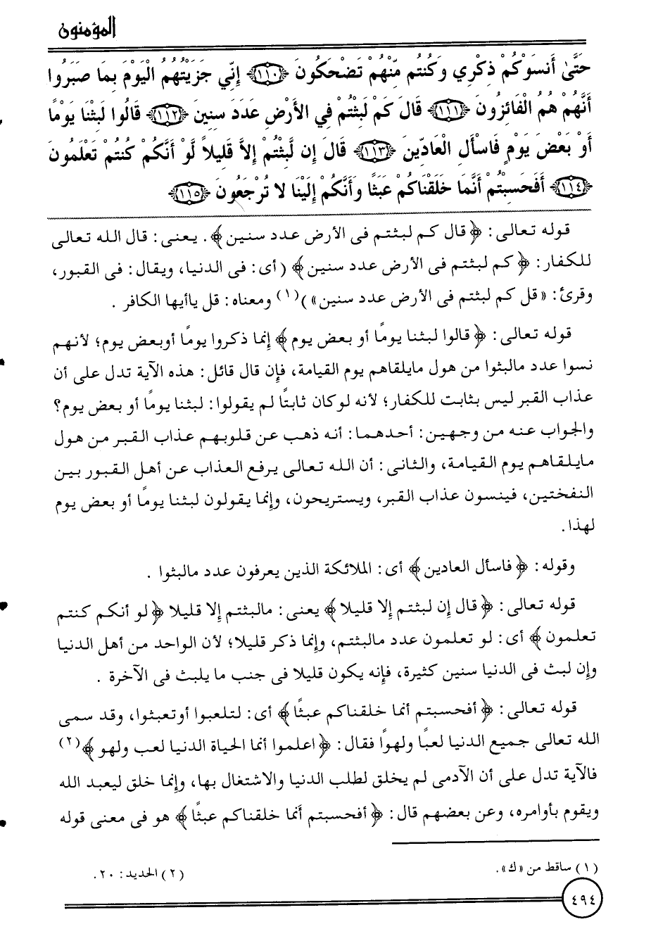{حَتَّى أنسوكم ذكري وكنتم مِنْهُم تضحكون (110) إِنِّي جزيتهم الْيَوْم بِمَا صَبَرُوا أَنهم هم الفائزون (111) قَالَ كم لبثتم فِي الأَرْض عدد سِنِين (112) قَالُوا لبثنا يَوْمًا أَو بعض يَوْم فاسأل العادين (113) قَالَ إِن لبثتم إِلَّا قَلِيلا لَو أَنكُمْ كُنْتُم تعلمُونَ (114) أفحسبتم أَنما خَلَقْنَاكُمْ عَبَثا وأنكم إِلَيْنَا لَا ترجعون (115) }