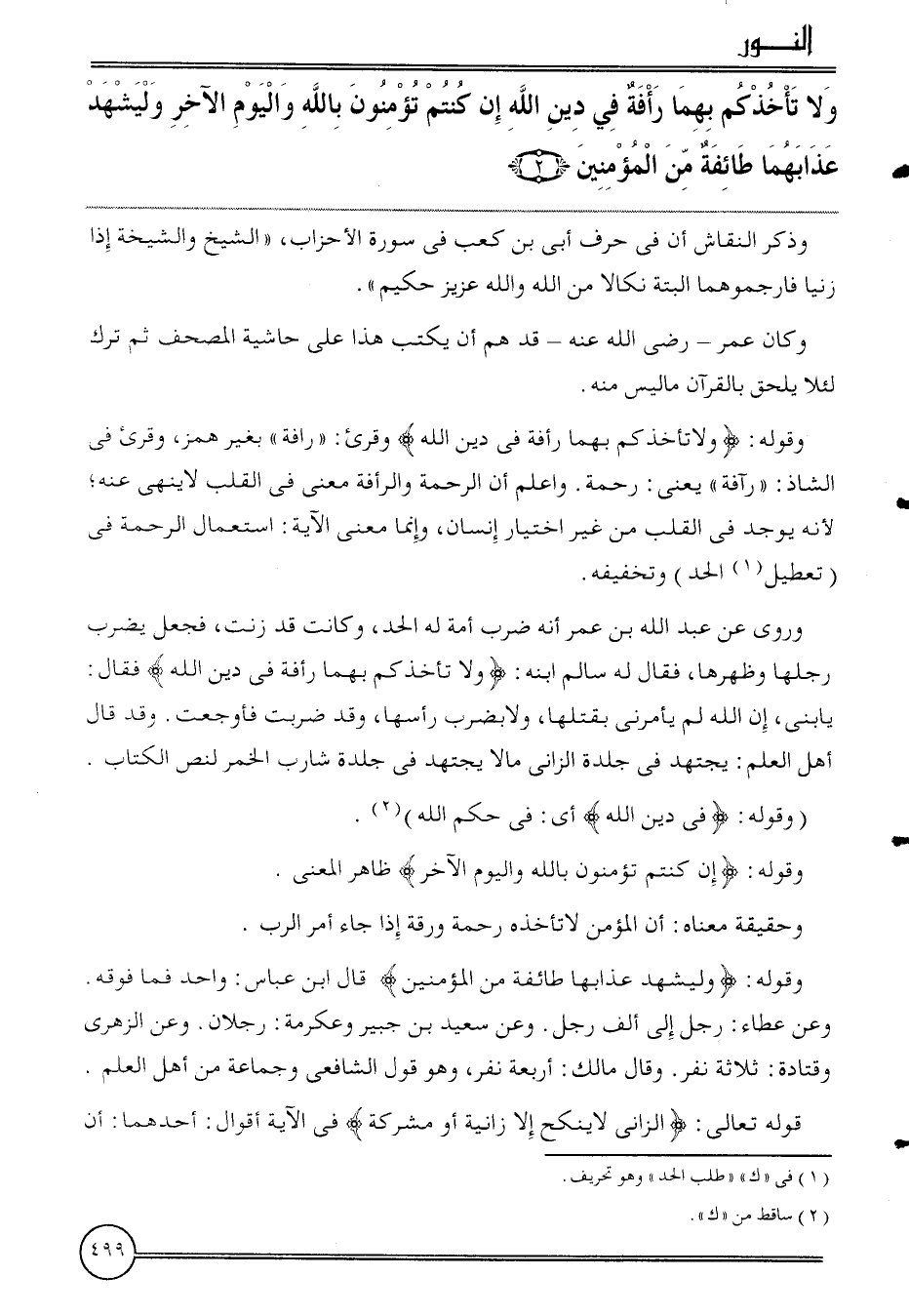 {وَلَا تأخذكم بهما رأفة فِي دين الله إِن كُنْتُم تؤمنون بِاللَّه وَالْيَوْم الآخر وليشهد عذابهما طَائِفَة من الْمُؤمنِينَ (2) }