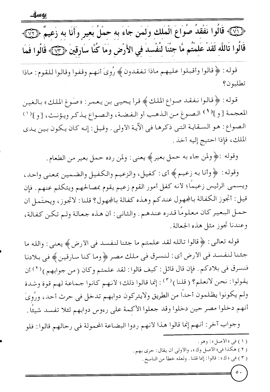 قَوْله: {قَالُوا نفقد صواع الْملك} قَرَأَ يحيى بن يعمر: " صوغ الْملك " بالغين الْمُعْجَمَة [و] الصوغ من الذَّهَب أَو الْفضة، والصواع يذكر وَيُؤَنث، [و] الصواع: هُوَ السِّقَايَة الَّتِي ذكرهَا فِي الْآيَة الأولى. وَقيل: إِنَّه كَانَ يكون بَين يَدي الْملك، فَإِذا احْتِيجَ إِلَيْهِ أَخذ.