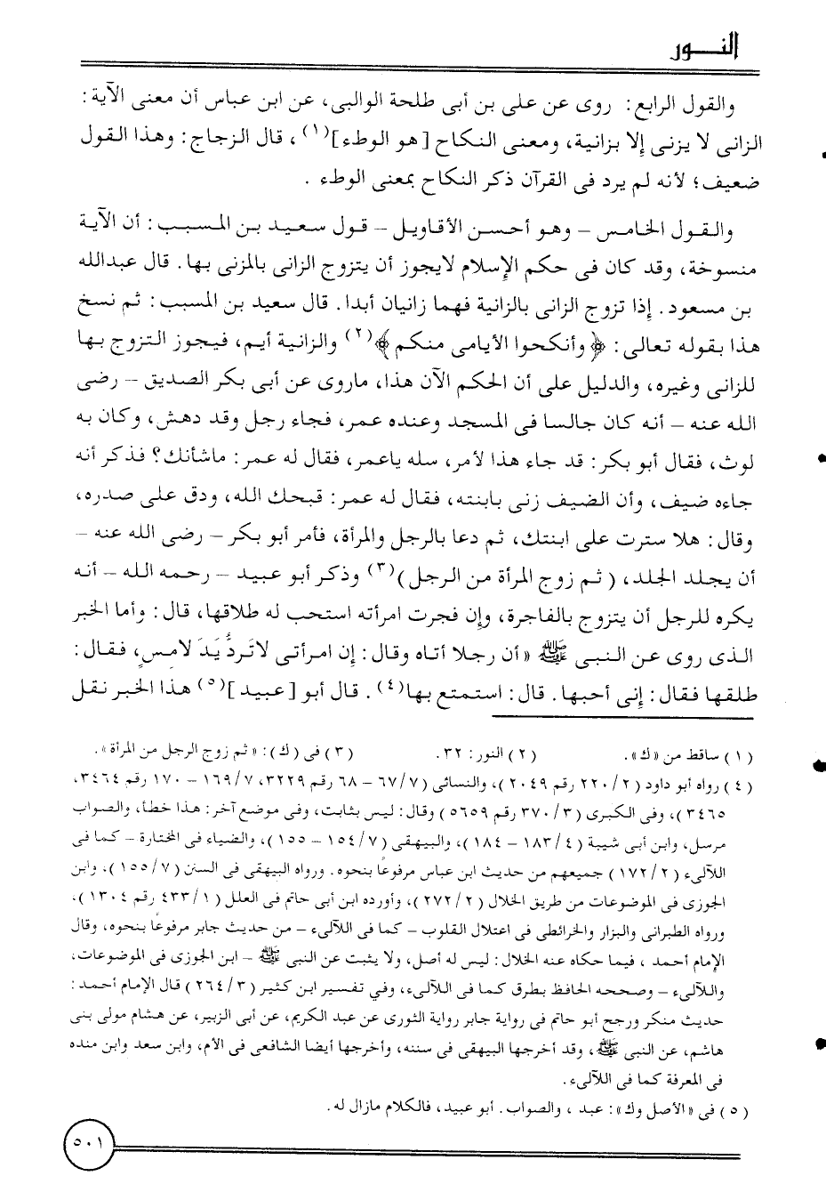 وَالْقَوْل الْخَامِس - وَهُوَ أحسن الْأَقَاوِيل - قَول سعيد بن الْمسيب: أَن الْآيَة مَنْسُوخَة، وَقد كَانَ فِي حكم الْإِسْلَام لَا يجوز أَن يتَزَوَّج الزَّانِي بالمزني بهَا. قَالَ عبد الله بن مَسْعُود. إِذا تزوج الزَّانِي بالزانية فهما زانيان أبدا. قَالَ سعيد بن الْمسيب: ثمَّ نسخ هَذَا بقوله تَعَالَى: {وَأنْكحُوا الْأَيَامَى مِنْكُم} والزانية أيم، فَيجوز التَّزَوُّج بهَا للزاني وَغَيره، وَالدَّلِيل على أَن الحكم الْآن هَذَا، مَا رُوِيَ عَن أبي بكر الصّديق - رَضِي الله عَنهُ - أَنه كَانَ جَالِسا فِي الْمَسْجِد وَعِنْده عمر، فجَاء رجل وَقد دهش، وَكَانَ بِهِ لوث، فَقَالَ أَبُو بكر: قد جَاءَ هَذَا لأمر، سَله يَا عمر، فَقَالَ لَهُ عمر: مَا شَأْنك؟ فَذكر أَنه جَاءَهُ ضيف، وَأَن الضَّيْف زنى بابنته، فَقَالَ لَهُ عمر: قبحك الله، ودق على صَدره، وَقَالَ: هلا سترت على ابْنَتك، ثمَّ دَعَا بِالرجلِ وَالْمَرْأَة، فَأمر أَبُو بكر - رَضِي الله عَنهُ - أَن يجلد الْجلد، (ثمَّ زوج الْمَرْأَة من الرجل) وَذكر أَبُو عبيد - رَحمَه الله - أَنه يكره للرجل أَن يتَزَوَّج بالفاجرة، وَإِن فجرت امْرَأَته اسْتحبَّ لَهُ طَلاقهَا، قَالَ: وَأما الْخَبَر الَّذِي رُوِيَ عَن النَّبِي " أَن رجلا أَتَاهُ وَقَالَ: إِن امْرَأَتي لَا ترد يَد لامس، فَقَالَ: طَلقهَا فَقَالَ: إِنِّي أحبها. قَالَ: استمتع بهَا. قَالَ أَبُو [عبيد] هَذَا الْخَبَر نقل
