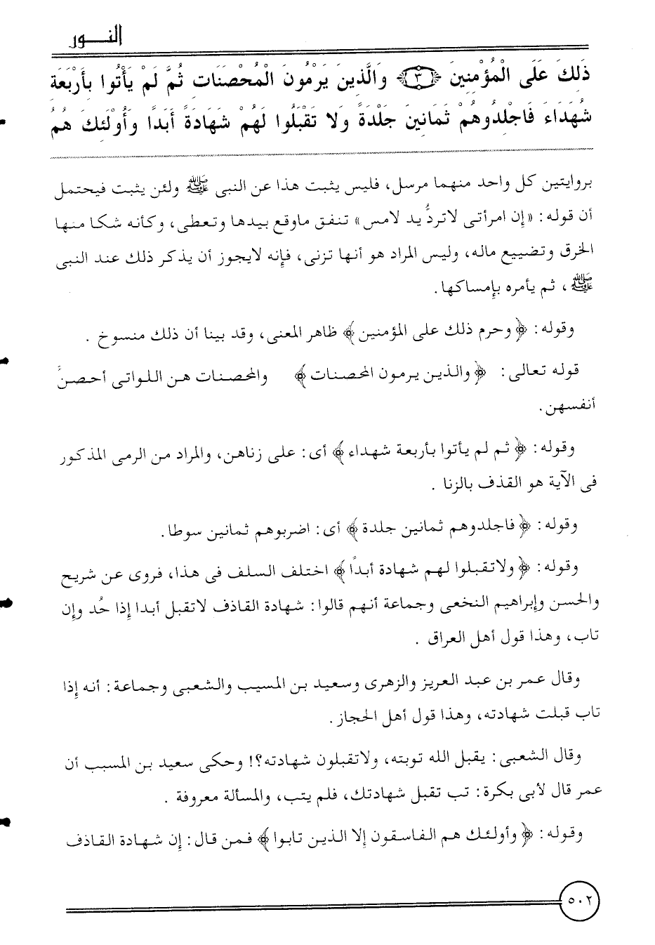 {ذَلِك على الْمُؤمنِينَ (3) وَالَّذين يرْمونَ الْمُحْصنَات ثمَّ لم يَأْتُوا بأَرْبعَة شُهَدَاء فَاجْلِدُوهُمْ ثَمَانِينَ جلدَة وَلَا تقبلُوا لَهُم شَهَادَة أبدا وَأُولَئِكَ هم} بروايتين كل وَاحِد مِنْهُمَا مُرْسل، فَلَيْسَ يثبت هَذَا عَن النَّبِي وَلَئِن يثبت فَيحْتَمل أَن قَوْله: " إِن امْرَأَتي لَا ترد يَد لامس " تنْفق مَا وَقع بِيَدِهَا وَتُعْطِي، وَكَأَنَّهُ شكا مِنْهَا الْخرق وتضييع مَاله، وَلَيْسَ المُرَاد هُوَ أَنَّهَا تَزني، فَإِنَّهُ لَا يجوز أَن يذكر ذَلِك عِنْد النَّبِي، ثمَّ يَأْمُرهُ بإمساكها.