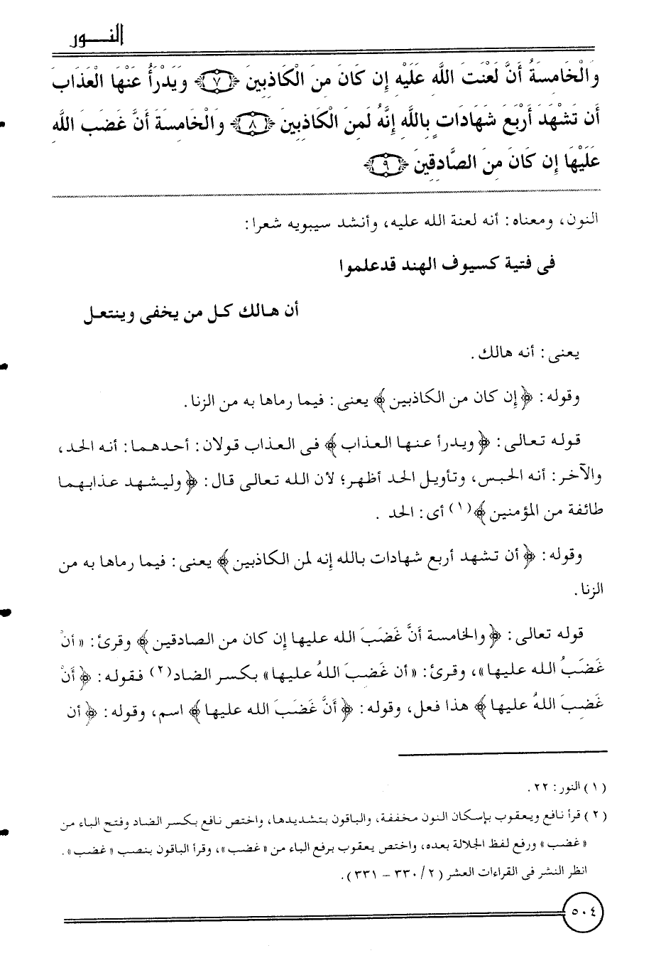 {وَالْخَامِسَة أَن لعنت الله عَلَيْهِ إِن كَانَ من الْكَاذِبين (7) ويدرأ عَنْهَا الْعَذَاب أَن تشهد أَربع شَهَادَات بِاللَّه إِنَّه لمن الْكَاذِبين (8) وَالْخَامِسَة أَن غضب الله عَلَيْهَا إِن كَانَ من الصَّادِقين (9) } النُّون، وَمَعْنَاهُ: أَنه لعنة الله عَلَيْهِ، وَأنْشد سِيبَوَيْهٍ شعرًا:
