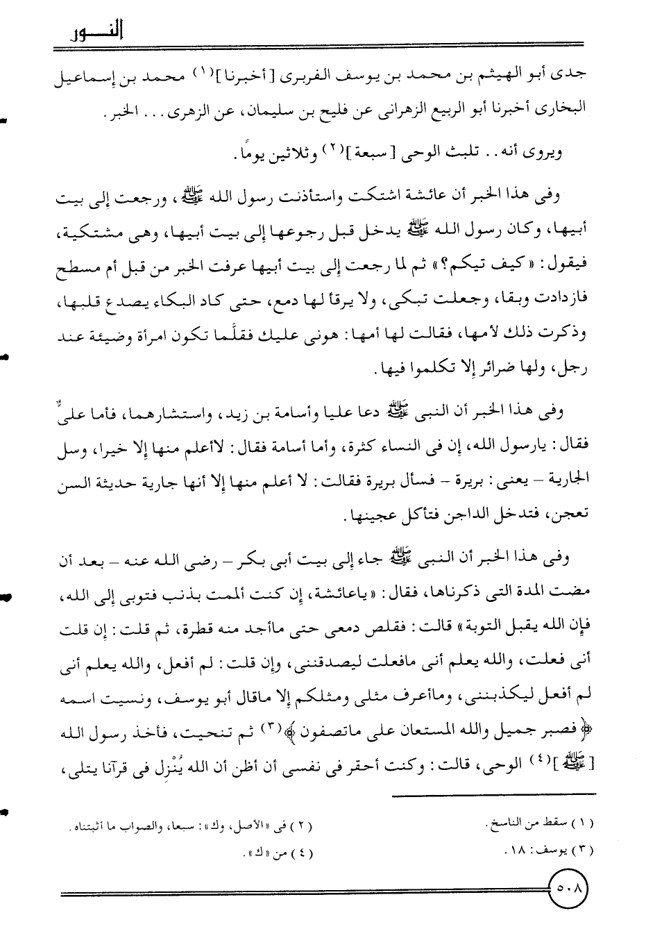 وَفِي هَذَا الْخَبَر أَن النَّبِي جَاءَ إِلَى بَيت أبي بكر - رَضِي الله عَنهُ - بعد أَن مَضَت الْمدَّة الَّتِي ذَكرنَاهَا، فَقَالَ: " يَا عَائِشَة، إِن كنت أَلممْت بذنب فتوبي إِلَى الله، فَإِن الله يقبل التَّوْبَة: قَالَت: فقلص دمعي حَتَّى مَا أجد مِنْهُ قَطْرَة، ثمَّ قلت: إِن قلت أَنِّي فعلت، وَالله يعلم أَنِّي مَا فعلت ليصدقنني، وَإِن قلت: لم أفعل، وَالله يعلم أَنِّي لم أفعل ليكذبنني، وَمَا أعرف مثلي ومثلكم إِلَّا مَا قَالَ أَبُو يُوسُف، ونسيت اسْمه {فَصَبر جميل وَالله الْمُسْتَعَان على مَا تصفون} ثمَّ تنحيت، فَأخذ رَسُول الله [] الْوَحْي، قَالَت: وَكنت أَحْقَر فِي نَفسِي أَن أَظن أَن الله ينزل فِي قُرْآنًا يُتْلَى،