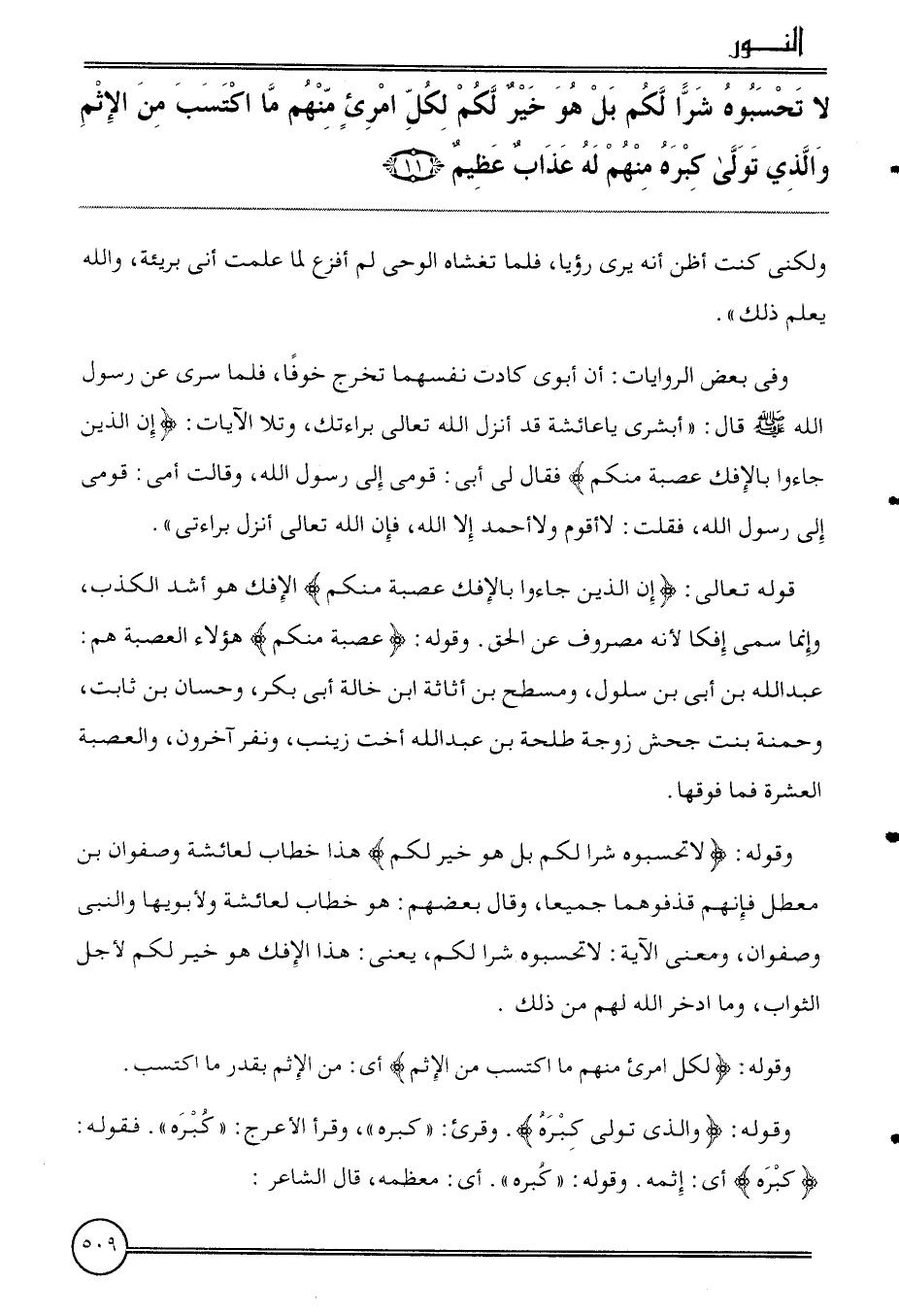 {لَا تحسبوه شرا لكم بل هُوَ خير لكم لكل امرىء مِنْهُم مَا اكْتسب من الْإِثْم وَالَّذِي تولى كبره مِنْهُم لَهُ عَذَاب عَظِيم (11) } وَلَكِنِّي كنت أَظن أَنه يرى رُؤْيا، فَلَمَّا تغشاه الْوَحْي لم أفزع لما علمت أَنِّي بريئة، وَالله يعلم ذَلِك ".
