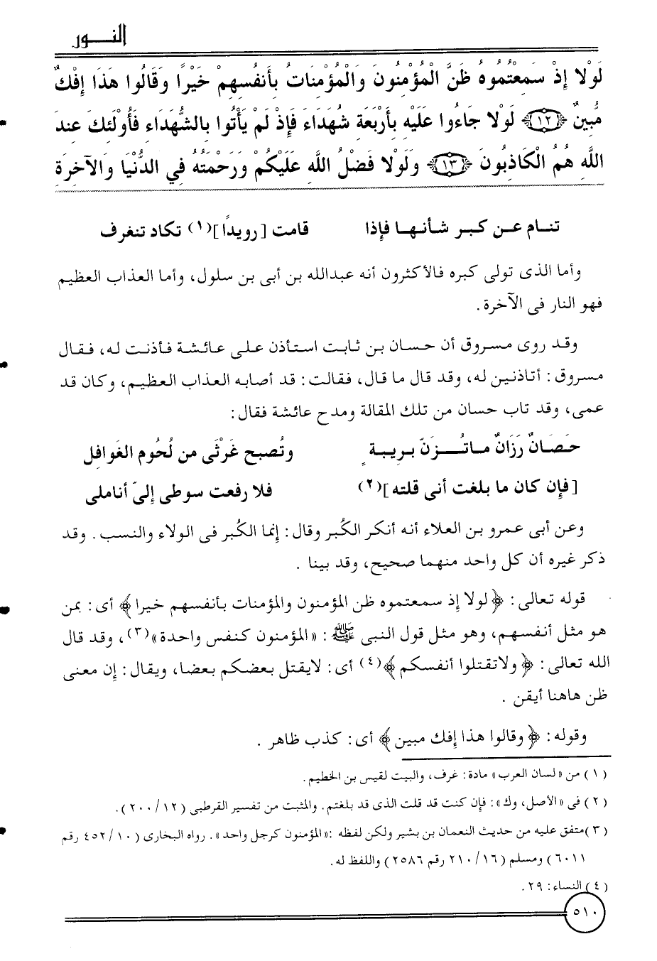{لَوْلَا إِذْ سمعتموه ظن الْمُؤْمِنُونَ وَالْمُؤْمِنَات بِأَنْفسِهِم خيرا وَقَالُوا هَذَا إفْك مُبين (12) لَوْلَا جَاءُوا عَلَيْهِ بأَرْبعَة شُهَدَاء فَإذْ لم يَأْتُوا بِالشُّهَدَاءِ فَأُولَئِك عِنْد الله هم الْكَاذِبُونَ (13) وَلَوْلَا فضل الله عَلَيْكُم وَرَحمته فِي الدُّنْيَا وَالْآخِرَة}
