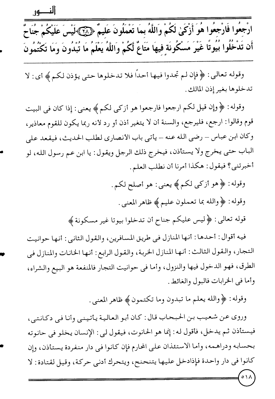 وَقَوله: {وَإِن قيل لكم ارْجعُوا فَارْجِعُوا هُوَ أزكى لكم} يَعْنِي: إِذا كَانَ فِي الْبَيْت قوم وَقَالُوا: ارْجع، فَليرْجع، وَالسّنة أَن لَا يتَغَيَّر أذن أَو رد لِأَنَّهُ رُبمَا يكون للْقَوْم معاذير، وَكَانَ ابْن عَبَّاس - رَضِي الله عَنهُ - يَأْتِي بَاب الْأنْصَارِيّ لطلب الحَدِيث، فيقعد على الْبَاب حَتَّى يخرج وَلَا يسْتَأْذن، فَيخرج ذَلِك الرجل وَيَقُول: يَا ابْن عَم رَسُول الله، لَو أَخْبَرتنِي؟ فَيَقُول: هَكَذَا أمرنَا أَن نطلب الْعلم.