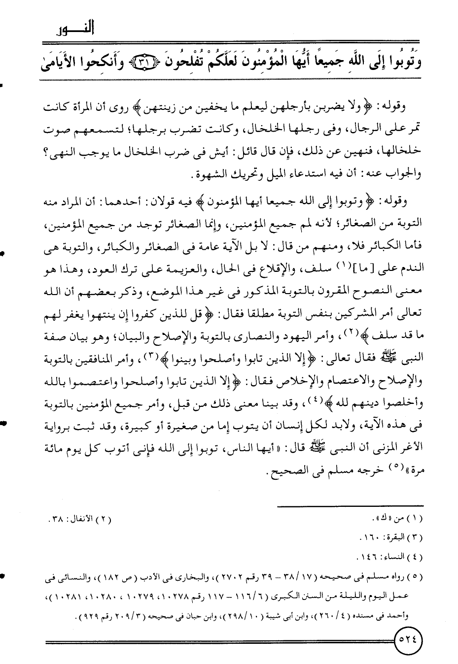 وَقَوله: {وتوبوا إِلَى الله جَمِيعًا أَيهَا الْمُؤْمِنُونَ} فِيهِ قَولَانِ: أَحدهمَا: أَن المُرَاد مِنْهُ التَّوْبَة من الصَّغَائِر؛ لِأَنَّهُ لمَم جَمِيع الْمُؤمنِينَ، وَإِنَّمَا الصَّغَائِر تُوجد من جَمِيع الْمُؤمنِينَ، فَأَما الْكَبَائِر فَلَا، وَمِنْهُم من قَالَ: لَا بل الْآيَة عَامَّة فِي الصَّغَائِر والكبائر، وَالتَّوْبَة هِيَ النَّدَم على [مَا] سلف، والإقلاع فِي الْحَال، والعزيمة على ترك الْعود، وَهَذَا هُوَ معنى النصوح المقرون بِالتَّوْبَةِ الْمَذْكُور فِي غير هَذَا الْموضع، وَذكر بَعضهم أَن الله تَعَالَى أَمر الْمُشْركين بِنَفس التَّوْبَة مُطلقًا فَقَالَ: {قل للَّذين كفرُوا إِن ينْتَهوا يغْفر لَهُم مَا قد سلف} ، وَأمر الْيَهُود وَالنَّصَارَى بِالتَّوْبَةِ والإصلاح وَالْبَيَان؛ وَهُوَ بَيَان صفة النَّبِي فَقَالَ تَعَالَى: {إِلَّا الَّذين تَابُوا وَأَصْلحُوا وبينوا} ، وَأمر الْمُنَافِقين بِالتَّوْبَةِ والإصلاح والاعتصام وَالْإِخْلَاص فَقَالَ: {إِلَّا الَّذين تَابُوا وَأَصْلحُوا واعتصموا بِاللَّه وَأَخْلصُوا دينهم لله} ، وَقد بَينا معنى ذَلِك من قبل، وَأمر جَمِيع الْمُؤمنِينَ بِالتَّوْبَةِ فِي هَذِه الْآيَة، وَلَا بُد لكل إِنْسَان أَن يَتُوب إِمَّا من صَغِيرَة أَو كَبِيرَة، وَقد ثَبت بِرِوَايَة الْأَغَر الْمُزنِيّ أَن النَّبِي قَالَ: " أَيهَا النَّاس، تُوبُوا إِلَى الله فَإِنِّي أَتُوب كل يَوْم مائَة مرّة " خرجه مُسلم فِي الصَّحِيح.