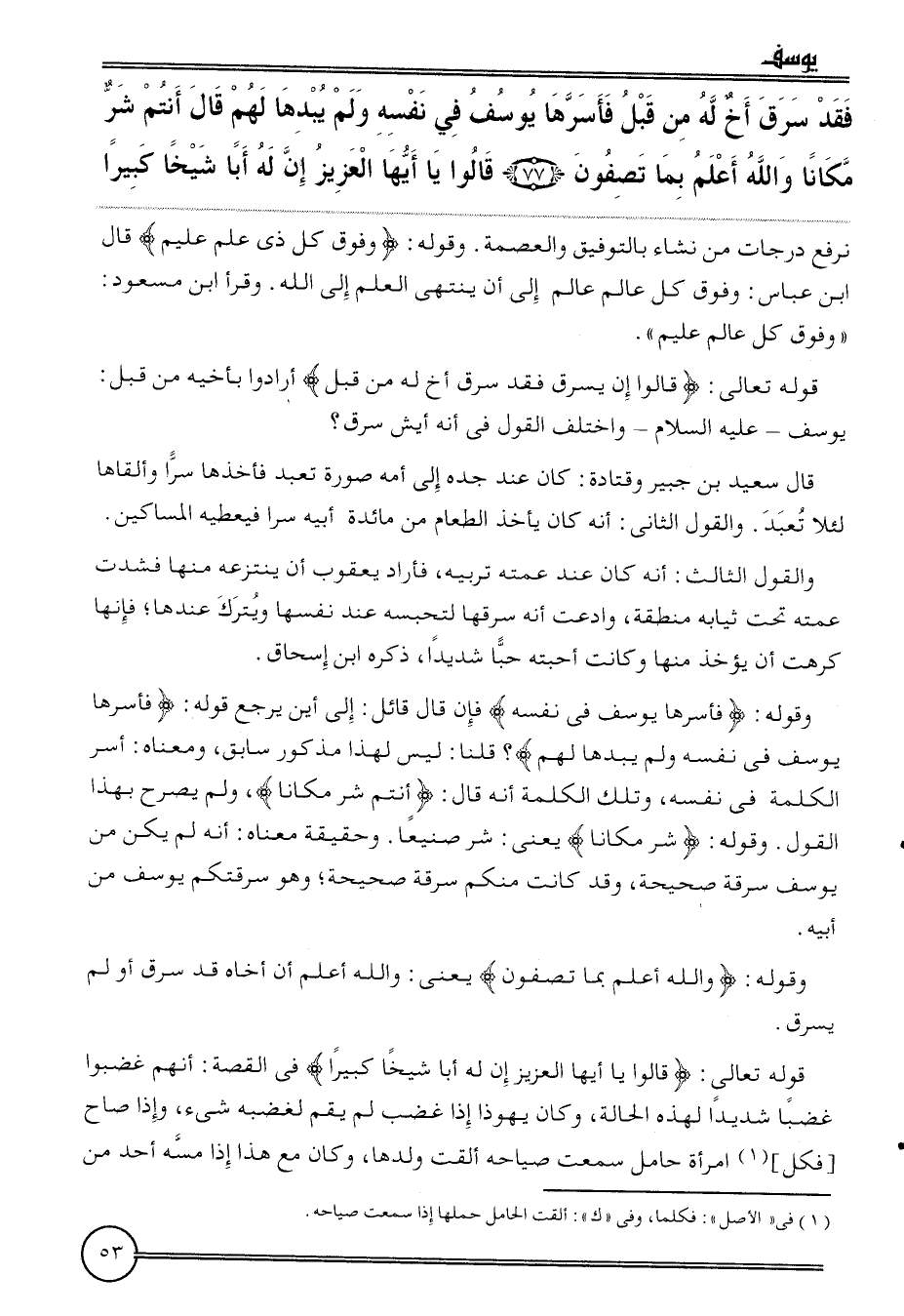 {فقد سرق أَخ لَهُ من قبل فأسرها يُوسُف فِي نَفسه وَلم يبدها لَهُم قَالَ أَنْتُم شَرّ مَكَانا وَالله أعلم بِمَا تصفون (77) قَالُوا يَا أَيهَا الْعَزِيز إِن لَهُ أَبَا شَيخا كَبِيرا} نرفع دَرَجَات من نشَاء بالتوفيق والعصمة. وَقَوله: {وَفَوق كل ذِي علم عليم} قَالَ ابْن عَبَّاس: وَفَوق كل عَالم عَالم إِلَى أَن يَنْتَهِي الْعلم إِلَى الله. وَقَرَأَ ابْن مَسْعُود: وَفَوق كل عَالم عليم ".