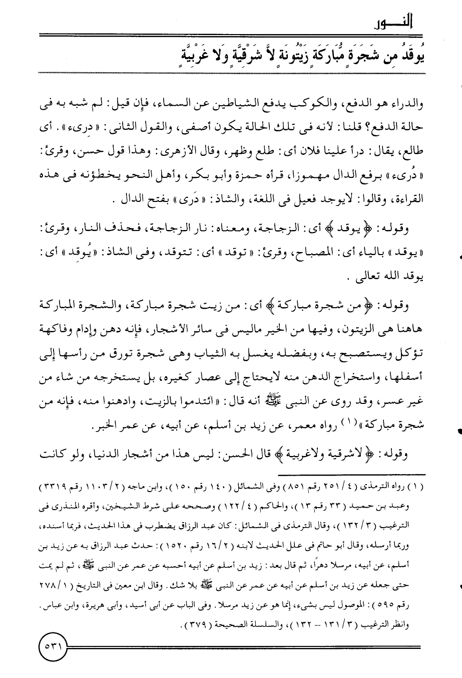 وَقَوله: {من شَجَرَة مباركة} أَي: من زَيْت شَجَرَة مباركة، والشجرة الْمُبَارَكَة هَاهُنَا هِيَ الزَّيْتُون، وفيهَا من الْخَيْر مَا لَيْسَ فِي سَائِر الْأَشْجَار، فَإِنَّهُ دهن وإدام وَفَاكِهَة تُؤْكَل ويستصبح بِهِ، وبفضله يغسل بِهِ الثِّيَاب وَهِي شَجَرَة تورق من رَأسهَا إِلَى أَسْفَلهَا، واستخراج الدّهن مِنْهُ لَا يحْتَاج إِلَى عصار كَغَيْرِهِ، بل يَسْتَخْرِجهُ من شَاءَ من غير عسر، وَقد رُوِيَ عَن النَّبِي أَنه قَالَ: " ائتدموا بالزيت، وادهنوا مِنْهُ، فَإِنَّهُ من شَجَرَة مباركة " رَوَاهُ معمر، عَن زيد بن أسلم، عَن أَبِيه، عَن عمر الْخَبَر.