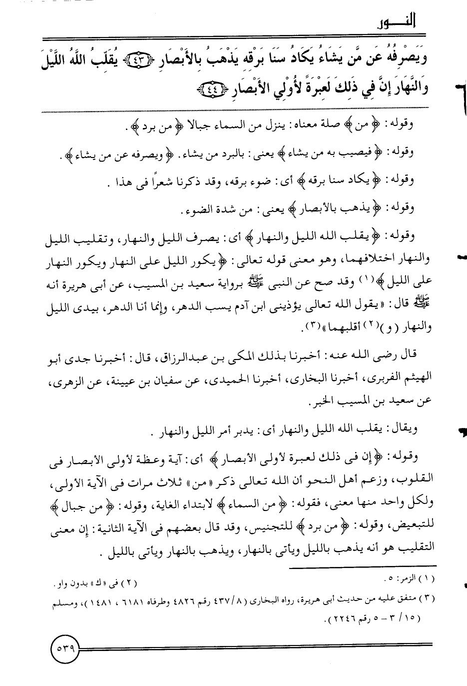 وَقَوله: {يقلب الله اللَّيْل وَالنَّهَار} أَي: يصرف اللَّيْل وَالنَّهَار، وتقليب اللَّيْل وَالنَّهَار اخْتِلَافهمَا، وَهُوَ معنى قَوْله تَعَالَى: {يكور اللَّيْل على النَّهَار ويكور النَّهَار على اللَّيْل} وَقد صَحَّ عَن النَّبِي بِرِوَايَة سعيد بن الْمسيب، عَن أبي هُرَيْرَة أَنه قَالَ: " يَقُول الله تَعَالَى يُؤْذِينِي ابْن آدم يسب الدَّهْر، وَإِنَّمَا أَنا الدَّهْر، بيَدي اللَّيْل وَالنَّهَار (و) أقلبهما ".