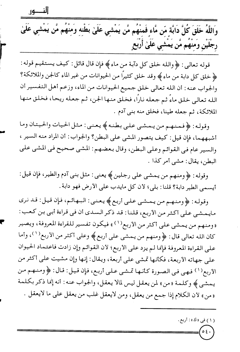 {وَالله خلق كل دَابَّة من مَاء فَمنهمْ من يمشي على بَطْنه وَمِنْهُم من يمشي على رجلَيْنِ وَمِنْهُم من يمشي على أَربع}