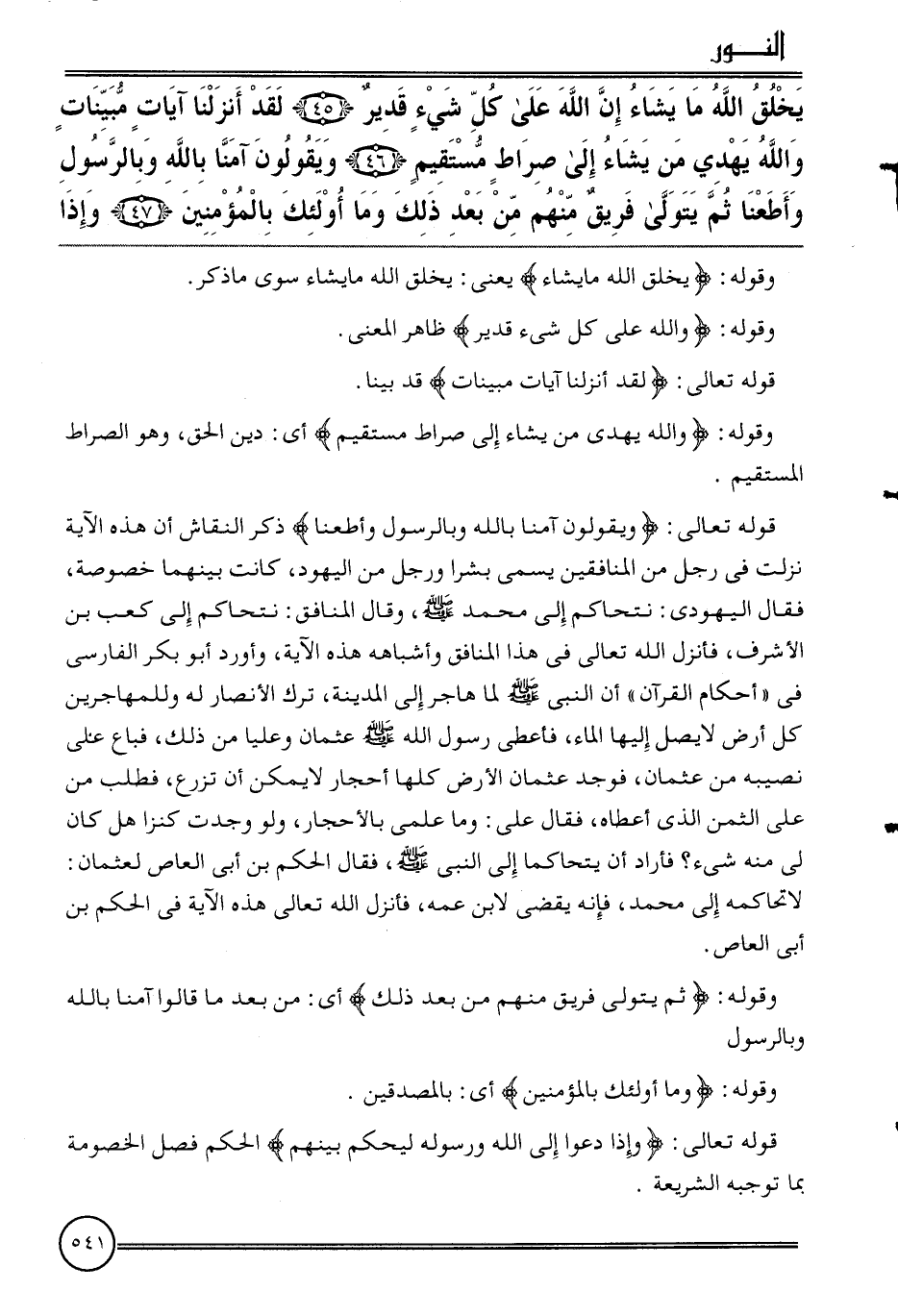 {يخلق الله مَا يَشَاء إِن الله على كل شَيْء قدير (45) لقد أنزلنَا آيَات مبينات وَالله يهدي من يَشَاء إِلَى صِرَاط مُسْتَقِيم (46) وَيَقُولُونَ آمنا بِاللَّه وبالرسول وأطعنا ثمَّ يتَوَلَّى فريق مِنْهُم من بعد ذَلِك وَمَا أُولَئِكَ بِالْمُؤْمِنِينَ (47) وَإِذا}