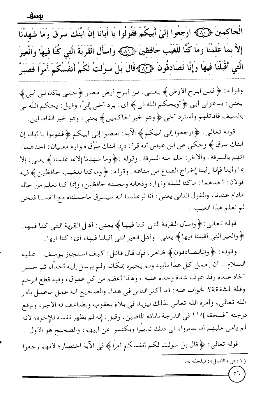 قَوْله تَعَالَى: {ارْجعُوا إِلَى أبيكم} الْآيَة: امضوا إِلَى أبيكم {فَقولُوا يَا أَبَانَا إِن ابْنك سرق} وَحكي عَن ابْن عَبَّاس أَنه قَرَأَ: " أَنه إِن ابْنك سرق " وَفِيه مَعْنيانِ: أَحدهمَا: اتهمَ بِالسَّرقَةِ. وَالْآخر: علم مِنْهُ السّرقَة. وَقَوله: {وَمَا شَهِدنَا إِلَّا بِمَا علمنَا} يَعْنِي: إِلَّا بِمَا رَأينَا فَإنَّا رَأينَا إِخْرَاج الصَّاع من مَتَاعه. وَقَوله: {وَمَا كُنَّا للغيب حافظين} فِيهِ قَولَانِ: أَحدهمَا: مَا كُنَّا لليله ونهاره وذهابه ومجيئه حافظين، وَإِنَّمَا كُنَّا نعلم من حَاله مادام عندنَا، وَالْقَوْل الثَّانِي يَعْنِي: أَنا لَو علمنَا أَنه سيسرق مَا حملناه مَعَ أَنْفُسنَا فَنحْن لم نعلم هَذَا الْغَيْب.
