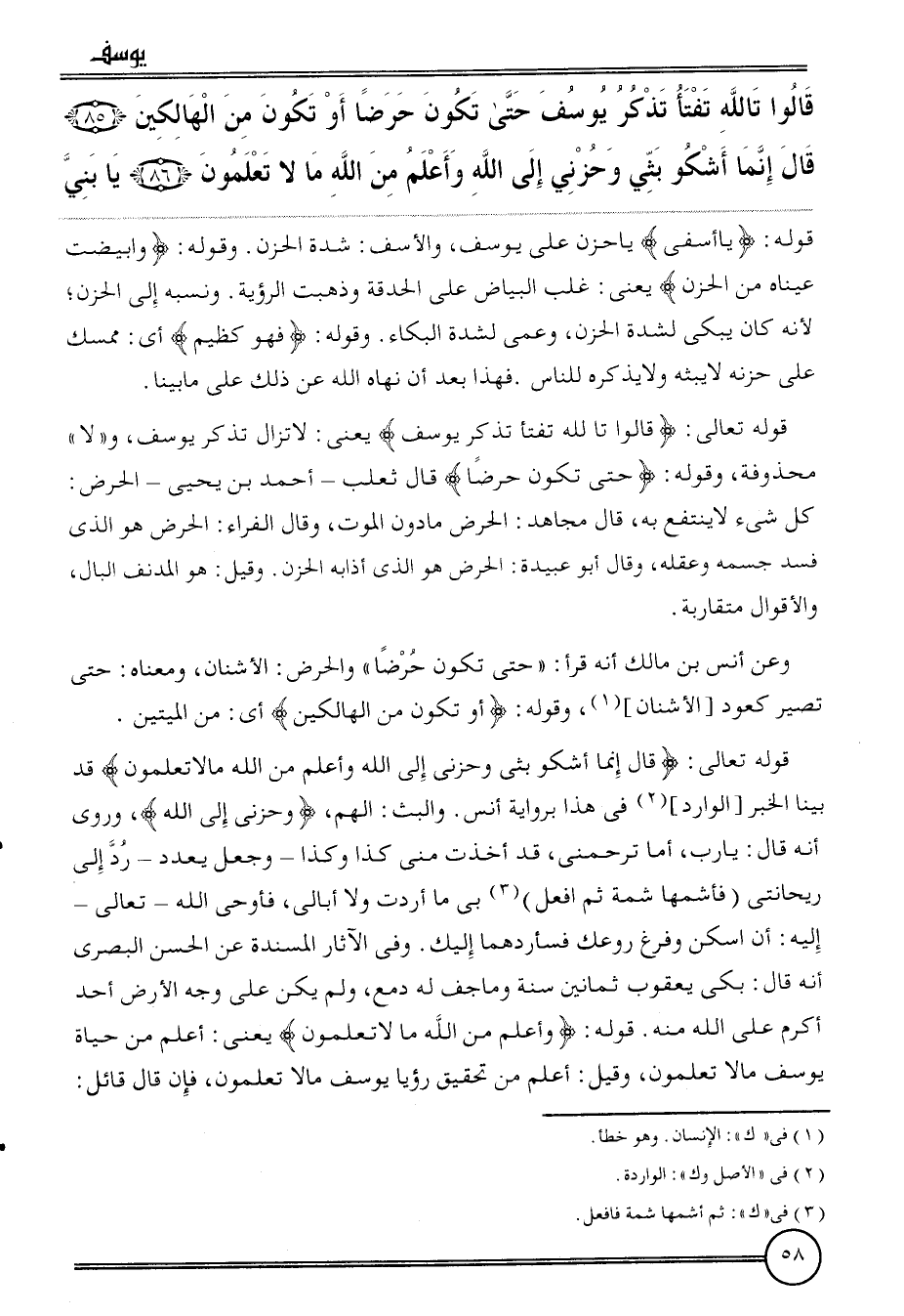 {قَالُوا تالله تفتأ تذكر يُوسُف حَتَّى تكون حرضا أَو تكون من الهالكين (85) قَالَ إِنَّمَا أَشْكُو بثي وحزني إِلَى الله وَأعلم من الله مَا لَا تعلمُونَ (86) يَا بني} قَوْله: {يَا أسفى} يَا حزن على يُوسُف، والأسف: شدَّة الْحزن. وَقَوله: {وابيضت عَيناهُ من الْحزن} يَعْنِي: غلب الْبيَاض على الحدقة وَذَهَبت الرُّؤْيَة. وَنسبه إِلَى الْحزن؛ لِأَنَّهُ كَانَ يبكي لشدَّة الْحزن وَعمي لشدَّة الْبكاء. وَقَوله: {فَهُوَ كظيم} أَي: مُمْسك على حزنه لَا يبثه وَلَا يذكرهُ للنَّاس. فَهَذَا بعد أَن نَهَاهُ الله عَن ذَلِك على مَا بَينا.