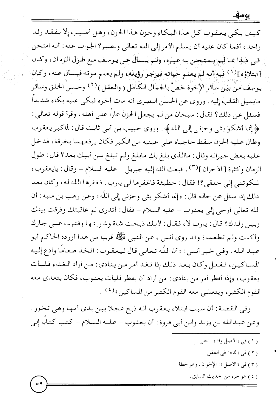 وَفِي الْقِصَّة: أَن سَبَب ابتلاء يَعْقُوب أَنه ذبح عجلا بَين يَدي أمهَا وَهِي تخور. وَعَن عبد الله بن يزِيد وَابْن أبي فَرْوَة: أَن يَعْقُوب - عَلَيْهِ السَّلَام - كتب كتابا إِلَى