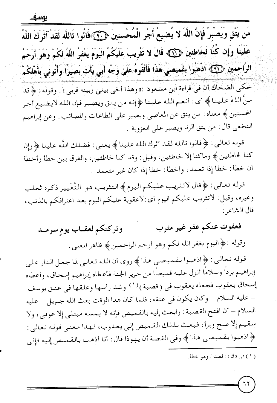 حكى الضَّحَّاك أَن فِي قِرَاءَة ابْن مَسْعُود: " وَهَذَا أخي بيني وَبَينه قربى ". وَقَوله: {قد من الله علينا} أَي: أنعم الله علينا {إِنَّه من يتق ويصبر فَإِن الله لَا يضيع أجر الْمُحْسِنِينَ} مَعْنَاهُ: من يتق عَن الْمعاصِي ويصبر على الطَّاعَات والمصائب. وَعَن إِبْرَاهِيم النَّخعِيّ قَالَ: من يتق الزِّنَا ويصبر على الْعُزُوبَة.
