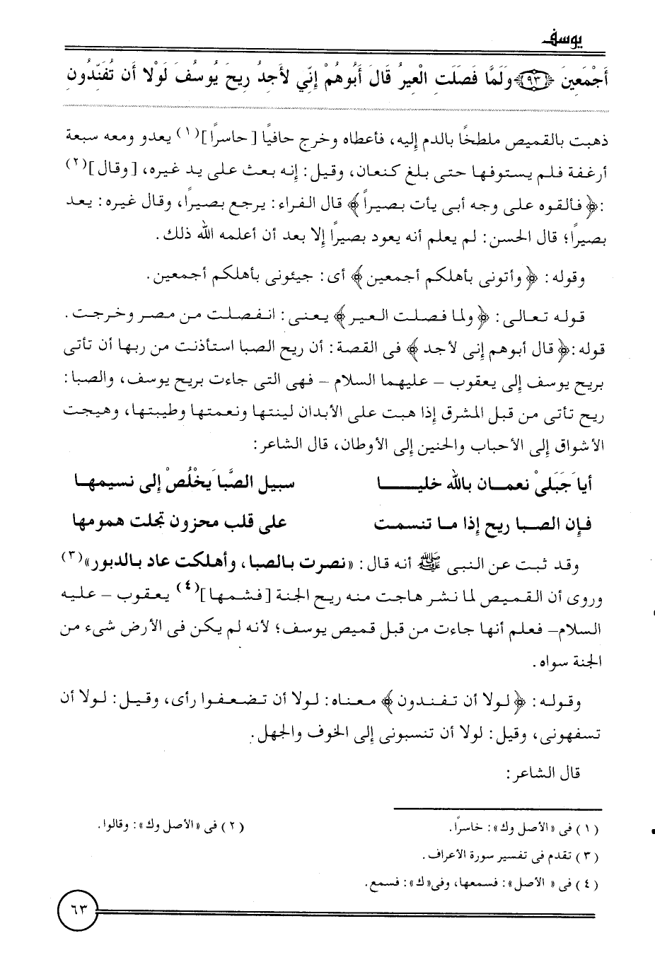 قَوْله تَعَالَى: {وَلما فصلت العير} يَعْنِي: انفصلت من مصر وَخرجت. قَوْله: {قَالَ أبوهم إِنِّي لأجد} فِي الْقِصَّة: أَن ريح الصِّبَا اسْتَأْذَنت من رَبهَا أَن تَأتي برِيح يُوسُف إِلَى يَعْقُوب - عَلَيْهِمَا السَّلَام - فَهِيَ الَّتِي جَاءَت برِيح يُوسُف، وَالصبَا: ريح تَأتي من قبل الْمشرق إِذا هبت على الْأَبدَان لينتها ونعمتها وطيبتها، وهيجت الأشواق إِلَى الأحباب والحنين إِلَى الأوطان، قَالَ الشَّاعِر: