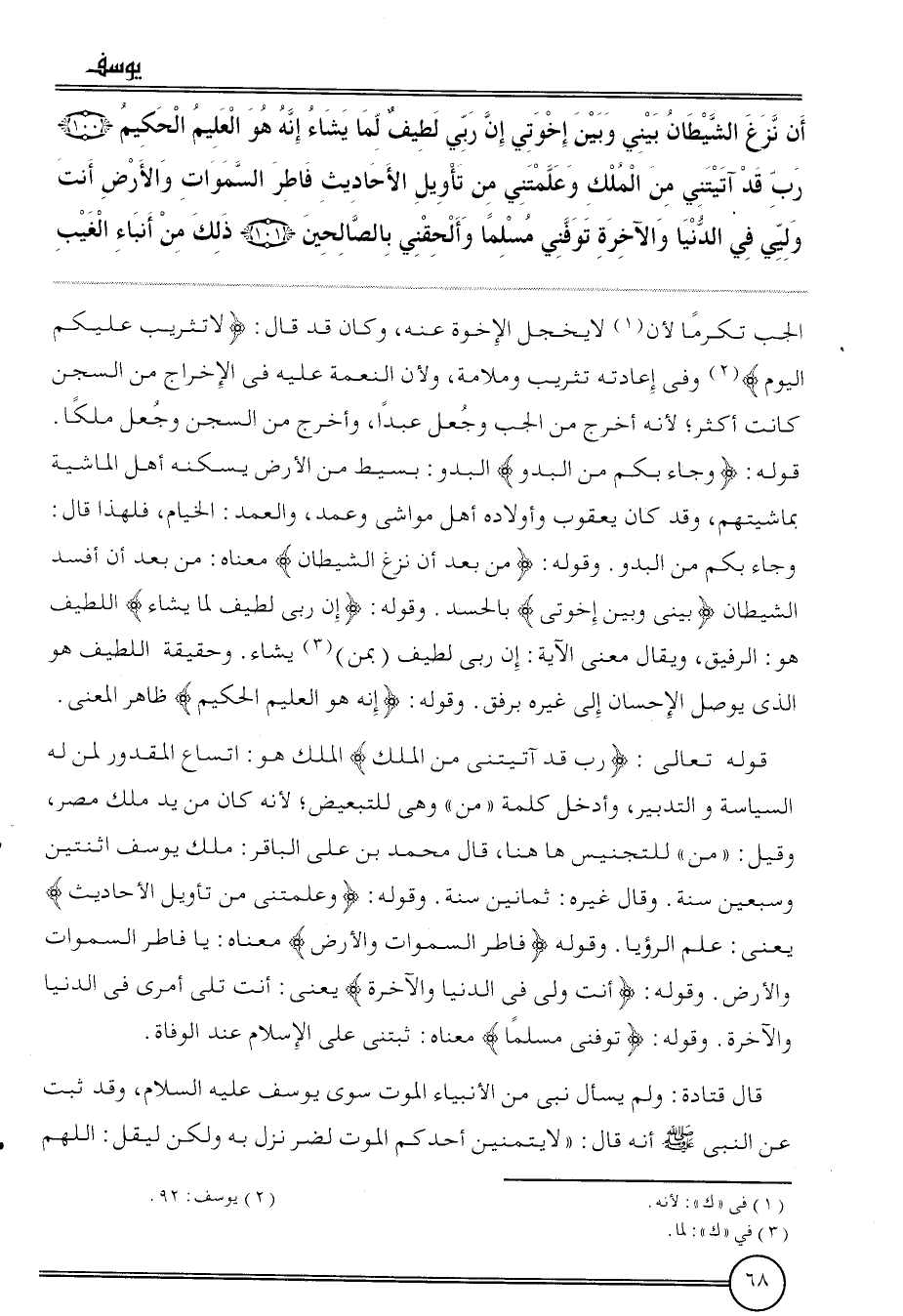 {أَن نَزغ الشَّيْطَان يَبْنِي وَبَين إخوتي إِن رَبِّي لطيف لما يَشَاء إِنَّه هُوَ الْعَلِيم الْحَكِيم (100) رب قد آتيتني من الْملك وعلمتني من تَأْوِيل الْأَحَادِيث فاطر السَّمَوَات وَالْأَرْض أَنْت وليي فِي الدُّنْيَا وَالْآخِرَة توفني مُسلما وألحقني بالصالحين (101) ذَلِك من أنباء الْغَيْب} الْجب تكرما لِأَن لَا يخجل الْإِخْوَة عَنهُ، وَكَانَ قد قَالَ: {لَا تَثْرِيب عَلَيْكُم الْيَوْم} وَفِي إِعَادَته تَثْرِيب وملامة، وَلِأَن النِّعْمَة عَلَيْهِ فِي الْإِخْرَاج من السجْن كَانَت أَكثر؛ لِأَنَّهُ أخرج من الْجب وَجعل عبدا، وَأخرج من السجْن وَجعل ملكا. قَوْله: {وَجَاء بكم من البدو} البدو: بسيط من الأَرْض يسكنهُ أهل الْمَاشِيَة بماشيتهم، وَقد كَانَ يَعْقُوب وَأَوْلَاده أهل مواشي وَعمد، والعمد: الْخيام، فَلهَذَا قَالَ: وَجَاء بكم من البدو. وَقَوله: {من بعد أَن نَزغ الشَّيْطَان} مَعْنَاهُ: من بعد أَن أفسد الشَّيْطَان {بيني وَبَين إخوتي} بِالْحَسَدِ. وَقَوله: {إِن رَبِّي لطيف لما يَشَاء} اللَّطِيف هُوَ: الرفيق، وَيُقَال معنى الْآيَة: إِن رَبِّي لطيف (بِمن) يَشَاء. وَحَقِيقَة اللَّطِيف هُوَ الَّذِي يُوصل الْإِحْسَان إِلَى غَيره بِرِفْق. وَقَوله: {إِنَّه هُوَ الْعَلِيم الْحَكِيم} ظَاهر الْمَعْنى.