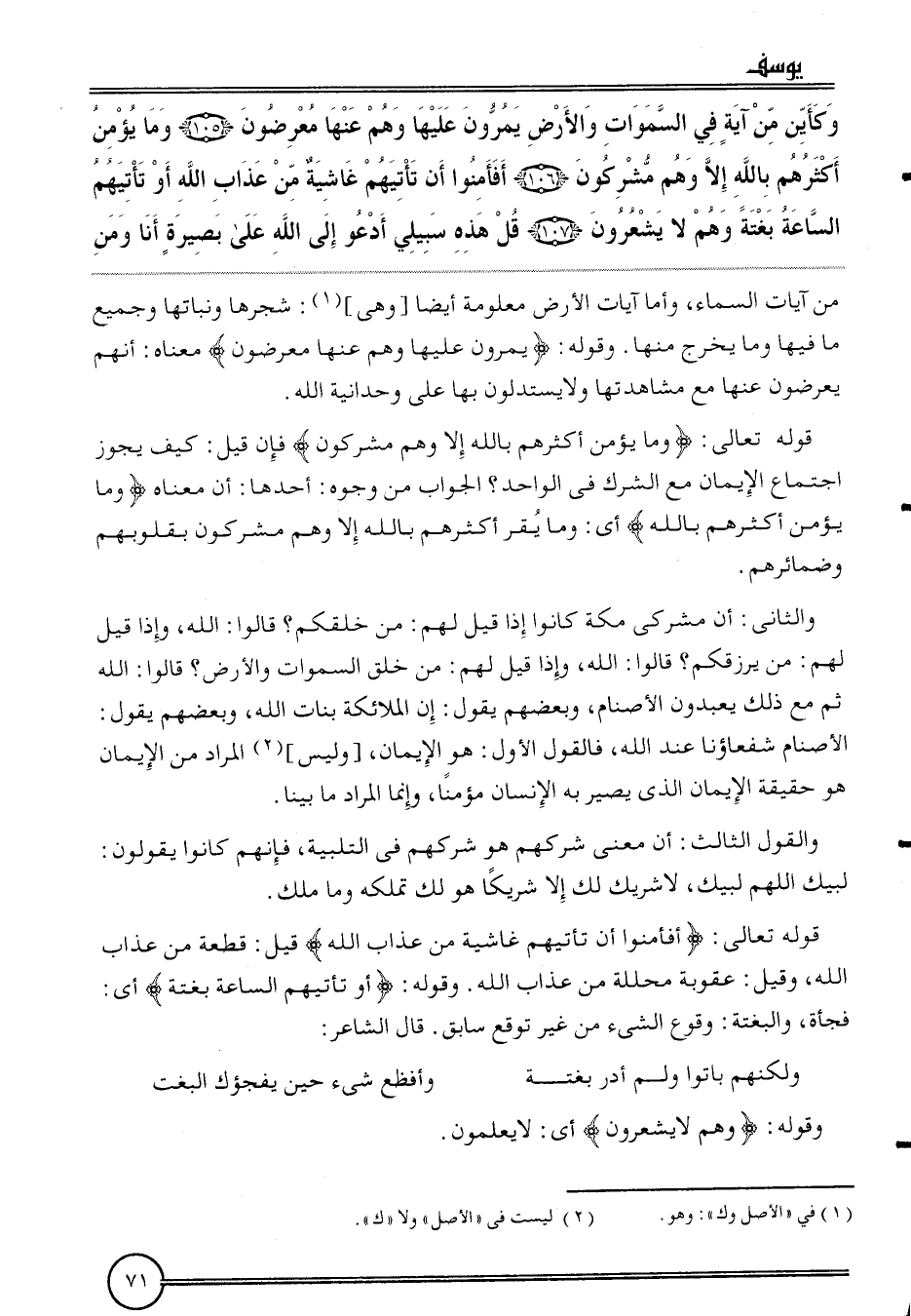 {وكأين من آيَة فِي السَّمَوَات وَالْأَرْض يَمرونَ عَلَيْهَا وهم عَنْهَا معرضون (105) وَمَا يُؤمن أَكْثَرهم بِاللَّه إِلَّا وهم مشركون (106) أفأمنوا أَن تأتيهم غاشية من عَذَاب الله أَو تأتيهم السَّاعَة بَغْتَة وهم لَا يَشْعُرُونَ (107) قل هَذِه سبيلي أَدْعُو إِلَى الله على بَصِيرَة أَنا وَمن} من آيَات السَّمَاء، وَأما آيَات الأَرْض مَعْلُومَة أَيْضا [وَهِي] : شَجَرهَا ونباتها وَجَمِيع مَا فِيهَا وَمَا يخرج مِنْهَا. وَقَوله: {يَمرونَ عَلَيْهَا وهم عَنْهَا معرضون} مَعْنَاهُ: أَنهم يعرضون عَنْهَا مَعَ مشاهدتها وَلَا يستدلون بهَا على وحدانية الله.