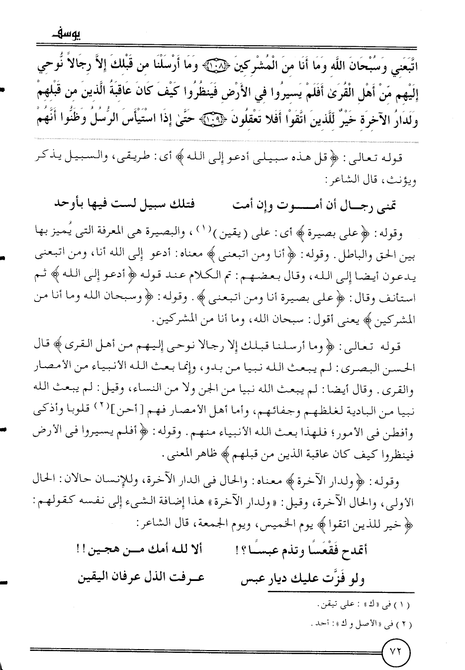 وَقَوله: {على بَصِيرَة} أَي: على (يَقِين) ، والبصيرة هِيَ الْمعرفَة الَّتِي يُمَيّز بهَا بَين الْحق وَالْبَاطِل. وَقَوله: {أَنا وَمن اتبعني} مَعْنَاهُ: أَدْعُو إِلَى الله أَنا، وَمن اتبعني يدعونَ أَيْضا إِلَى الله، وَقَالَ بَعضهم: تمّ الْكَلَام عِنْد قَوْله {أَدْعُو إِلَى الله} ثمَّ اسْتَأْنف وَقَالَ: {على بَصِيرَة أَنا وَمن اتبعني} . وَقَوله: {وَسُبْحَان الله وَمَا أَنا من الْمُشْركين} يَعْنِي أَقُول: سُبْحَانَ الله، وَمَا أَنا من الْمُشْركين.