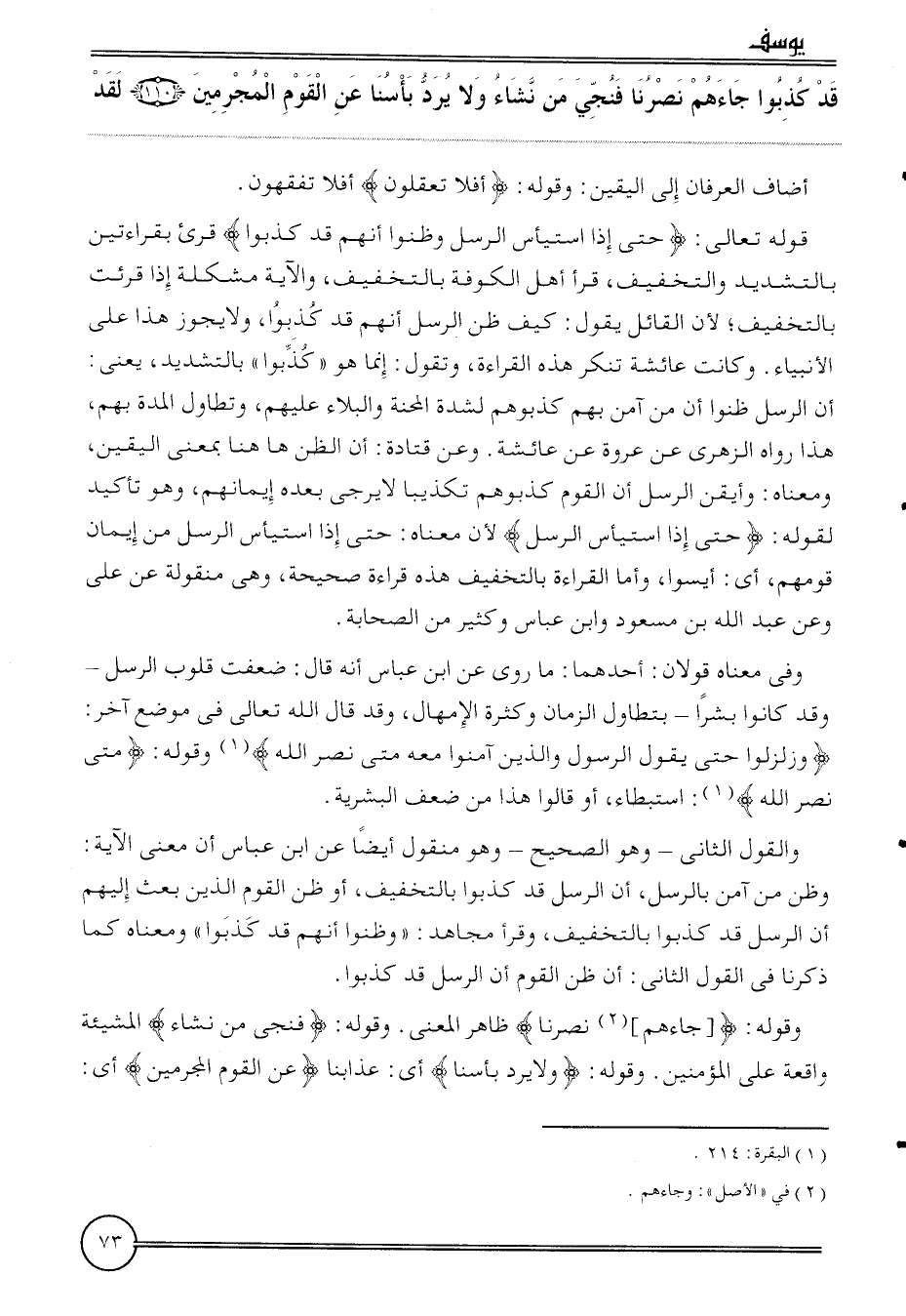 وَالْقَوْل الثَّانِي - وَهُوَ الصَّحِيح - وَهُوَ مَنْقُول أَيْضا عَن ابْن عَبَّاس أَن معنى الْآيَة: وَظن من آمن بالرسل، أَن الرُّسُل قد كذبُوا بِالتَّخْفِيفِ، أَو ظن الْقَوْم الَّذين بعث إِلَيْهِم أَن الرُّسُل قد كذبُوا بِالتَّخْفِيفِ، وَقَرَأَ مُجَاهِد: " وظنوا أَنهم قد كذبُوا " وَمَعْنَاهُ كَمَا ذكرنَا فِي القَوْل الثَّانِي: أَن ظن الْقَوْم أَن الرُّسُل قد كذبُوا.