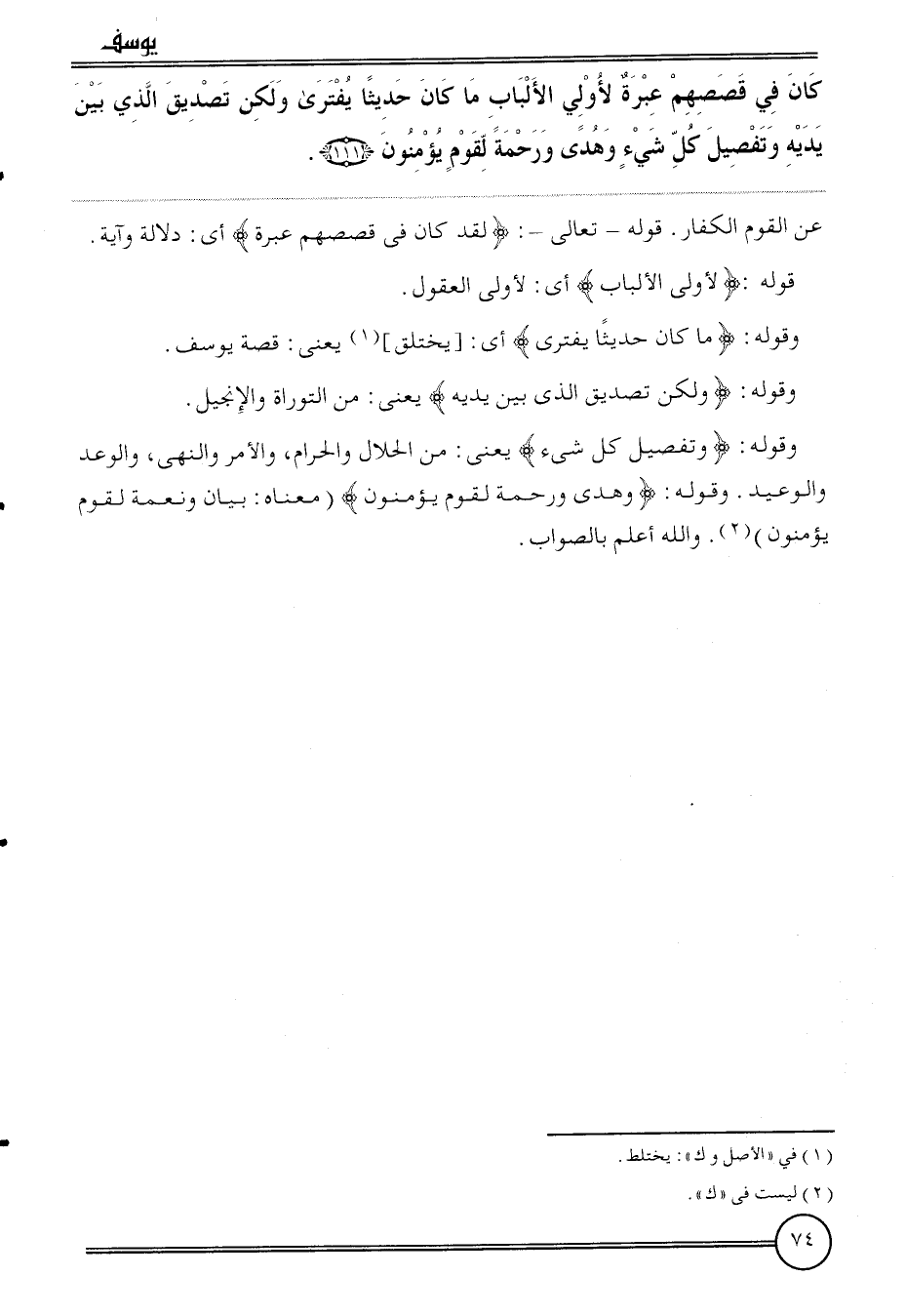 {كَانَ فِي قصصهم عِبْرَة لأولي الْأَلْبَاب مَا كَانَ حَدِيثا يفترى وَلَكِن تَصْدِيق الَّذِي بَين يَدَيْهِ وتفصيل كل شَيْء وَهدى وَرَحْمَة لقوم يُؤمنُونَ (111) } عَن الْقَوْم الْكفَّار.