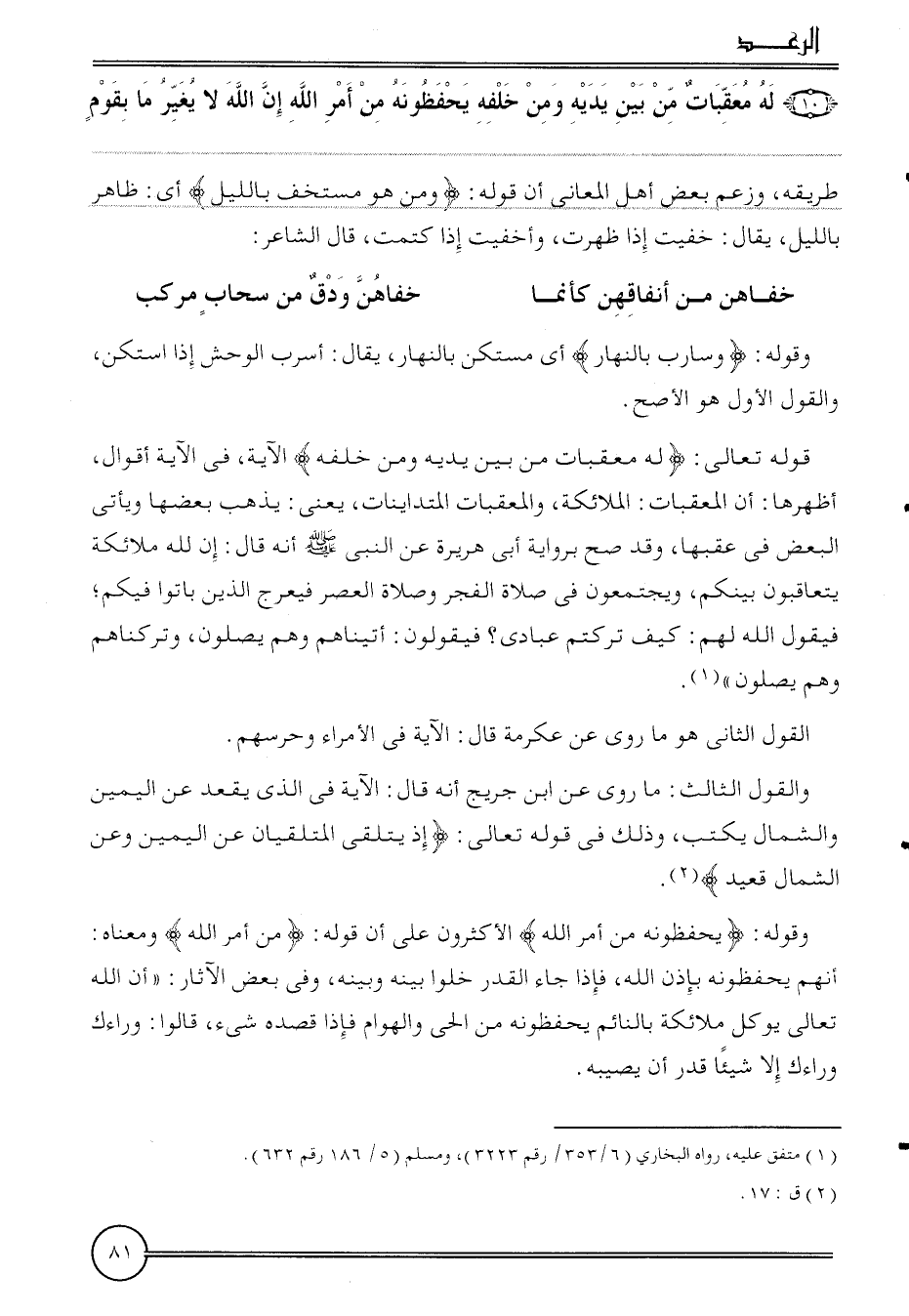 قَوْله تَعَالَى: {لَهُ مُعَقِّبَات من بَين يَدَيْهِ وَمن خَلفه} الْآيَة، فِي الْآيَة أَقْوَال، أظهرها: أَن المعقبات: الْمَلَائِكَة، والمعقبات المتداينات، يَعْنِي: يذهب بَعْضهَا وَيَأْتِي الْبَعْض فِي عَقبهَا، وَقد صَحَّ بِرِوَايَة أبي هُرَيْرَة عَن النَّبِي أَنه قَالَ: إِن لله مَلَائِكَة يتعاقبون بَيْنكُم، ويجتمعون فِي صَلَاة الْفجْر وَصَلَاة الْعَصْر فيعرج الَّذين باتوا فِيكُم؛ فَيَقُول الله لَهُم: كَيفَ تركْتُم عبَادي؟ فَيَقُولُونَ: أتيناهم وهم يصلونَ، وتركناهم وهم يصلونَ.