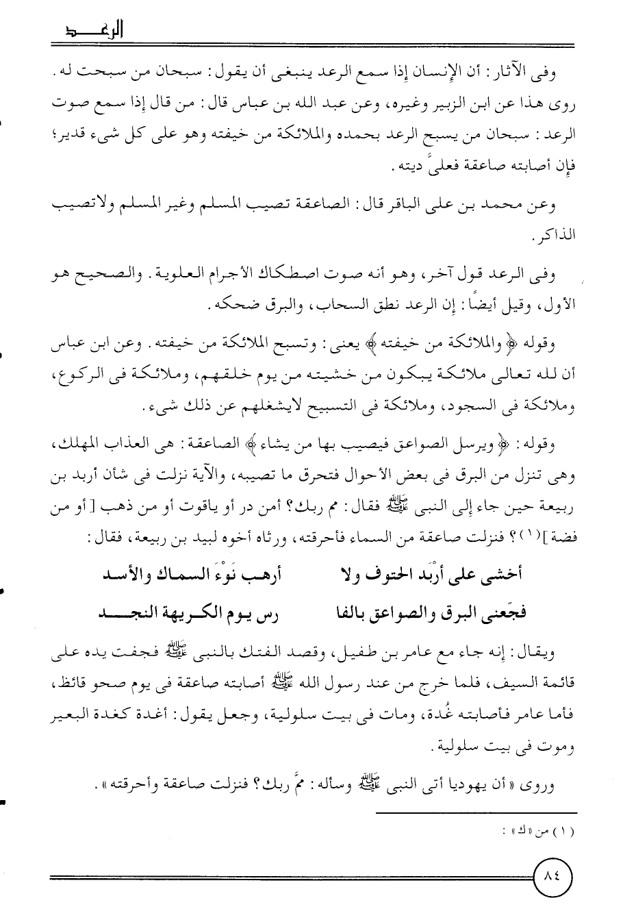وَفِي الْآثَار: أَن الْإِنْسَان إِذا سمع الرَّعْد يَنْبَغِي أَن يَقُول: سُبْحَانَ من سبحت لَهُ. رُوِيَ هَذَا عَن ابْن الزبير وَغَيره، وَعَن عبد الله بن عَبَّاس قَالَ: من قَالَ إِذا سمع صَوت الرَّعْد: سُبْحَانَ من يسبح الرَّعْد بِحَمْدِهِ وَالْمَلَائِكَة من خيفته وَهُوَ على كل شَيْء قدير؛ فَإِن أَصَابَته صَاعِقَة فعلى دِيَته.