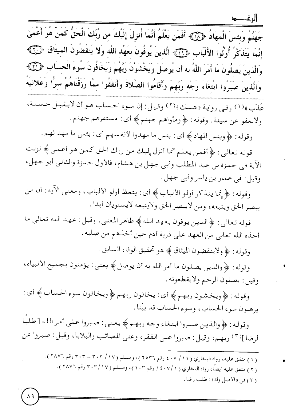 {جَهَنَّم وَبئسَ المهاد (18) أَفَمَن يعلم أَنما أنزل إِلَيْك من رَبك الْحق كمن هُوَ أعمى إِنَّمَا يتَذَكَّر أولُوا الْأَلْبَاب (19) الَّذين يُوفونَ بِعَهْد الله وَلَا ينقضون الْمِيثَاق (20) وَالَّذين يصلونَ مَا أَمر الله بِهِ أَن يُوصل ويخشون رَبهم وَيَخَافُونَ سوء الْحساب (21) وَالَّذين صَبَرُوا ابْتِغَاء وَجه رَبهم وَأَقَامُوا الصَّلَاة وأنفقوا مِمَّا رَزَقْنَاهُمْ سرا وَعَلَانِيَة} عذب " وَفِي رِوَايَة " هلك " وَقيل: إِن سوء الْحساب هُوَ أَن لَا يقبل حَسَنَة، وَلَا يعْفُو عَن سَيِّئَة. وَقَوله: {ومأواهم جَهَنَّم} أَي: مستقرهم جَهَنَّم.