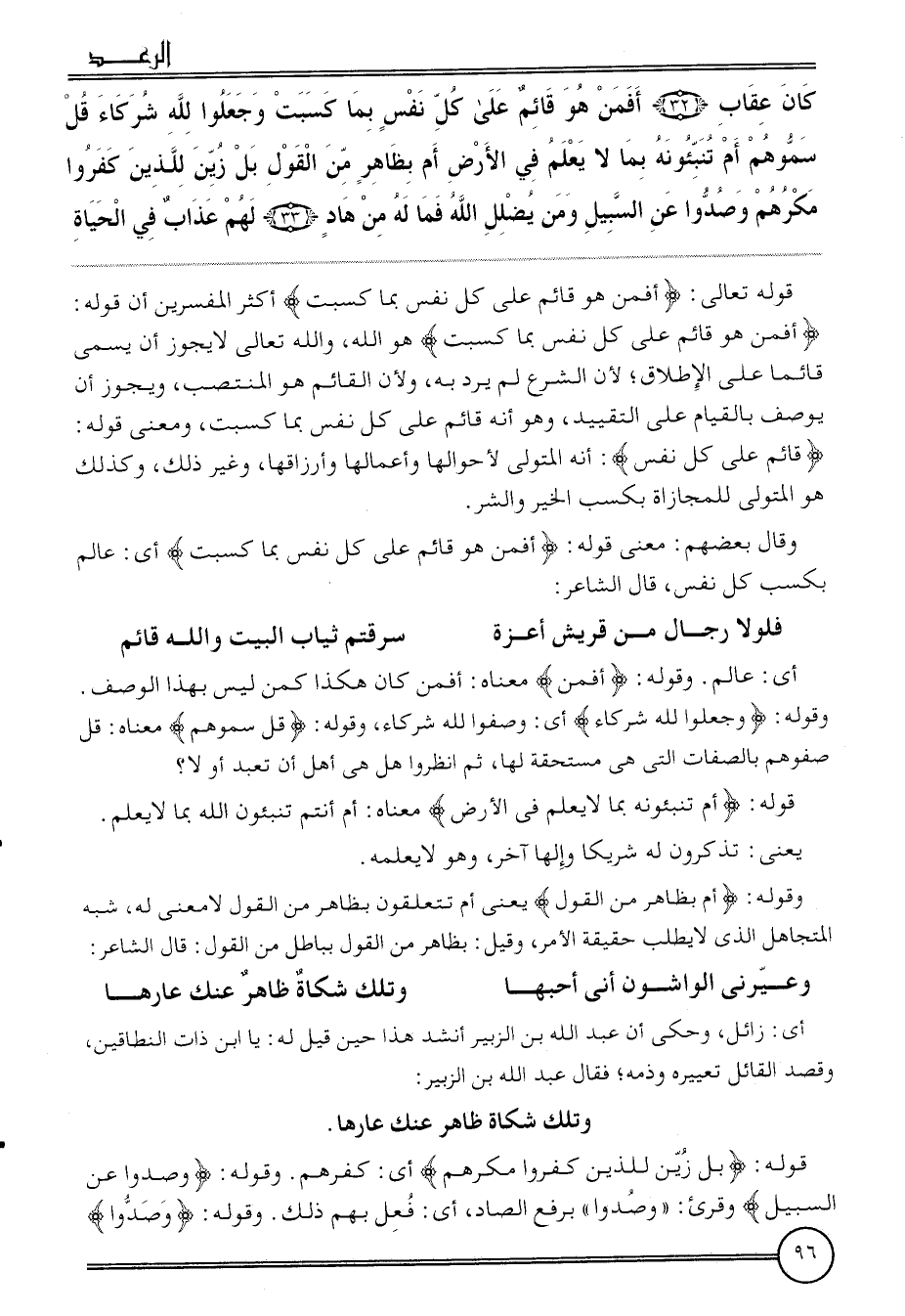 قَوْله تَعَالَى: {أَفَمَن هُوَ قَائِم على كل نفس بِمَا كسبت} أَكثر الْمُفَسّرين أَن قَوْله: {أَفَمَن هُوَ قَائِم على كل نفس بِمَا كسبت} هُوَ الله، وَالله تَعَالَى لَا يجوز أَن يُسمى قَائِما على الْإِطْلَاق؛ لِأَن الشَّرْع لم يرد بِهِ، وَلِأَن الْقَائِم هُوَ المنتصب، وَيجوز أَن يُوصف بِالْقيامِ على التَّقْيِيد، وَهُوَ أَنه قَائِم على كل نفس بِمَا كسبت، وَمعنى قَوْله: {قَائِم على كل نفس} : أَنه الْمُتَوَلِي لأحوالها وأعمالها وأرزاقها، وَغير ذَلِك، وَكَذَلِكَ هُوَ الْمُتَوَلِي للمجازاة بكسب الْخَيْر وَالشَّر.