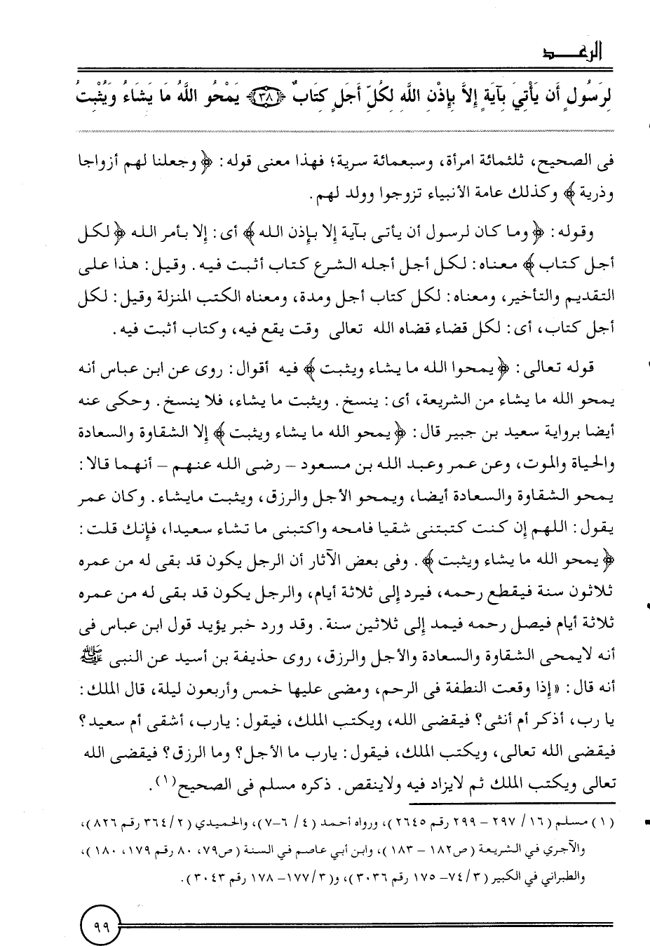 قَوْله تَعَالَى: {يمحو الله مَا يَشَاء وَيثبت} فِيهِ أَقْوَال: رُوِيَ عَن ابْن عَبَّاس أَنه يمحو الله مَا يَشَاء من الشَّرِيعَة، أَي: ينْسَخ. وَيثبت مَا يَشَاء، فَلَا ينْسَخ. وَحكي عَنهُ أَيْضا بِرِوَايَة سعيد بن جُبَير قَالَ: {يمحو الله مَا يَشَاء وَيثبت} إِلَّا الشقاوة والسعادة والحياة وَالْمَوْت، وَعَن عمر وَعبد الله بن مَسْعُود - رَضِي الله عَنْهُم - أَنَّهُمَا قَالَا: يمحو الشقاوة والسعادة أَيْضا، ويمحو الْأَجَل والرزق، وَيثبت مَا يَشَاء. وَكَانَ عمر يَقُول: اللَّهُمَّ إِن كنت كتبتني شقيا فامحه واكتبني مَا تشَاء سعيدا، فَإنَّك قلت: {يمحو الله مَا يَشَاء وَيثبت} . وَفِي بعض الْآثَار أَن الرجل يكون قد بَقِي لَهُ من عمره ثَلَاثُونَ سنة فَيقطع رَحمَه، فَيرد إِلَى ثَلَاثَة أَيَّام، وَالرجل يكون قد بَقِي لَهُ من عمره ثَلَاثَة أَيَّام فيصل رَحمَه فيمد إِلَى ثَلَاثِينَ سنة. وَقد ورد خبر يُؤَيّد قَول ابْن عَبَّاس فِي أَنه لَا يمحى الشقاوة والسعادة وَالْأَجَل والرزق، روى حُذَيْفَة بن أسيد عَن النَّبِي أَنه قَالَ: " إِذا وَقعت النُّطْفَة فِي الرَّحِم، وَمضى عَلَيْهَا خمس وَأَرْبَعُونَ لَيْلَة، قَالَ الْملك: يَا رب، أذكر أم أُنْثَى؟ فَيَقْضِي الله، وَيكْتب الْملك، فَيَقُول: يَا رب، أشقي أم سعيد؟ فَيَقْضِي الله تَعَالَى، وَيكْتب الْملك، فَيَقُول: يَا رب مَا الْأَجَل؟ وَمَا الرزق؟ فَيَقْضِي الله تَعَالَى وَيكْتب الْملك ثمَّ لَا يُزَاد فِيهِ وَلَا ينقص. ذكره مُسلم فِي الصَّحِيح.