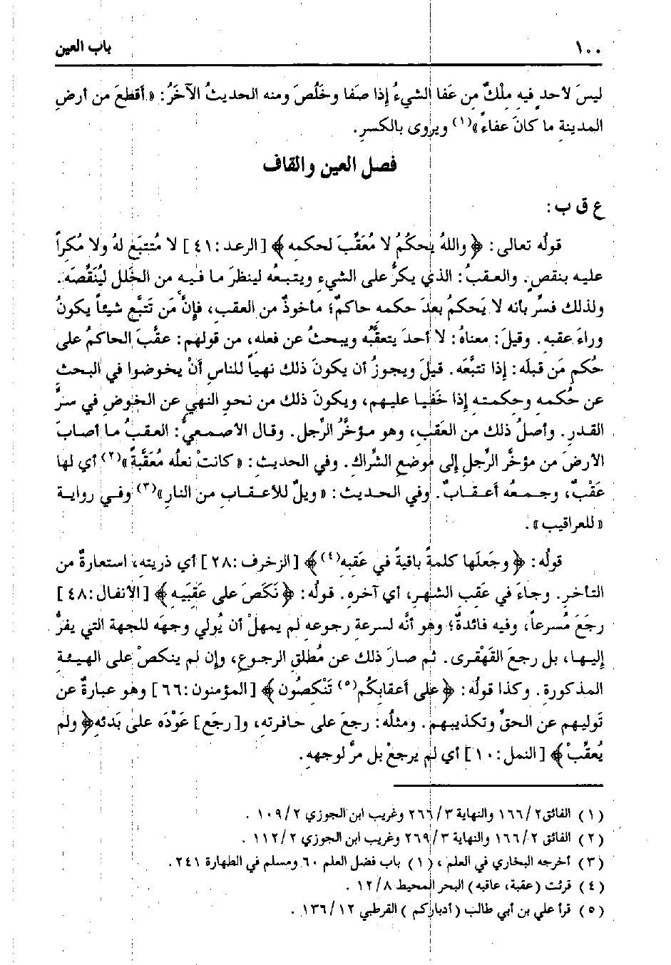 قوله:} وجعلها كلمًة باقيًة في عقبه {[الزخرف: 28] أي ذريته، استعارة من التأخر. وجاء في عقب الشهر، أي آخره. قوله:} نكص على عقبيه {[الأنفال: 48] رجع مسرعًا، وفيه فائدة؛ وهو أنه لسرعة رجوعه لم يمهل أن يولي وجهه للجهة التي يفر إليها، بل رجع القهقري. ثم صار ذلك عن مطلق الرجوع، وإن لم ينكص على الهيئة المذكورة. وكذا قوله:} على أعقابكم تنكصون {[المؤمنون: 66] وهو عبارة عن توليهم عن الحق وتكذيبهم. ومثله: رجع على حافرته، و [رجع] عوده على بدئه} ولم يعقب {[النمل: 10] أي لم يرجع بل مر لوجهه.