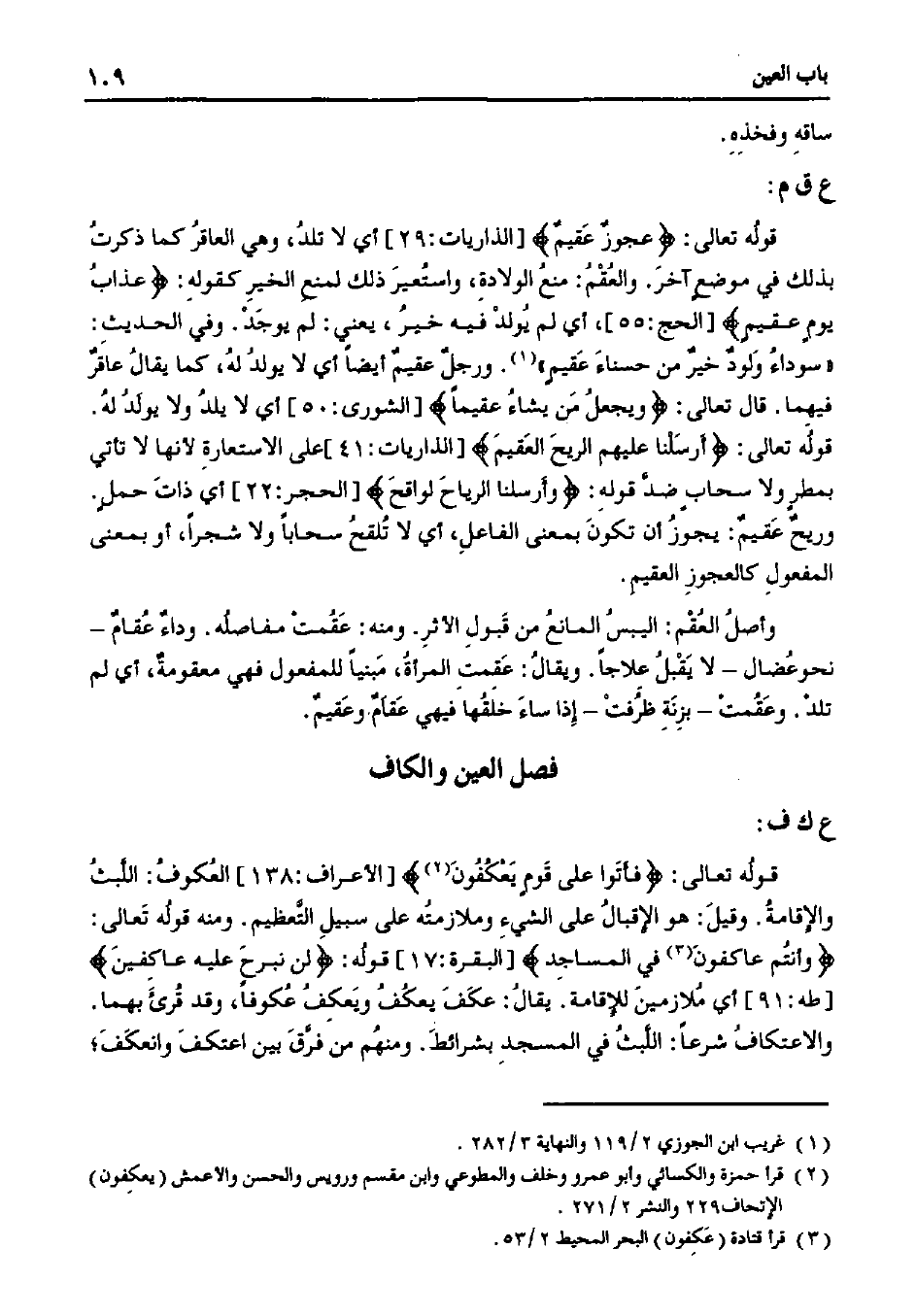 قوله تعالى: {فأتوا على قومٍ يعكفون} [الأعراف:138] العكوف: اللبث والإقامة. وقيل: هو الإقبال على الشيء وملازمته على سبيل التعظيم. ومنه قوله تعالى: {وأنتم عاكفون في المساجد} [البقرة:17] قوله: {لن نبرح عليه عاكفين} [طه:91] أي ملازمين للإقامة. يقال: عكف يعكف ويعكف عكوفًا، وقد قرئ بهما. والاعتكاف شرعًا: اللبث في المسجد بشرائط. ومنهم من فرق بين اعتكف وانعكف؛
