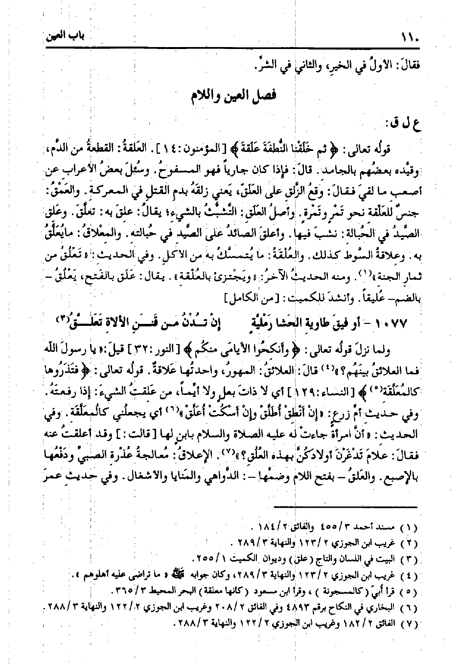 ولما نزل قوله تعالى: {وأنكحوا الأيامى منكم} [النور:32] قيل: «يا رسول الله فما العلائق بينهم؟» قال: العلائق: المهور، واحدتها علاقة. قوله تعالى: {فتذروها كالمعلقة} [النساء:129] أي لا ذات بعلٍ ولا أيما، من علقت الشيء: إذا رفعته. وفي حديث أم زرع: «إن أنطق أطلق وإن أسكت أعلق» أي يجعلني كالمعلقة. وفي الحديث: «أن امرأة جاءت له عليه الصلاة والسلام بابنٍ لها [قالت:] وقد أعلقت عنه فقال: علام تدغرن أولادكن بهذه العلق؟». الإعلاق: معالجة عذرة الصبي ودفعها بالإصبع. والعلق -بفتح اللام وضمها-: الدواهي والمنايا والأشغال. وفي حديث عمر