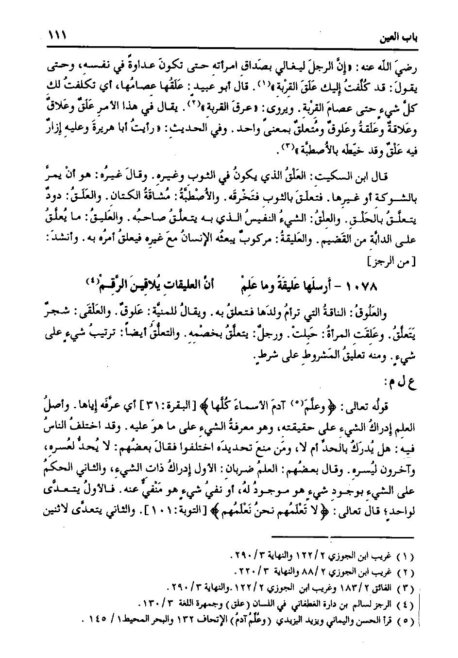 رضي الله عنه: «إن الرجل ليغالي بصداق امرأته حتى تكون عداوةً في نفسه، وحتى يقول: قد كلفت إليك علق القربة». قال أبو عبيد: علقها عصامها، أي تكلفت لك كل شيءٍ حتى عصام القربة. ويروى: «عرق القربة». يقال في هذا الأمر علق وعلاق وعلاقة وعلقة وعلوق ومتعلق بمعنى واحد. وفي الحديث: «رأيت أبا هريرة وعليه إزار فيه علق وقد خيطه بالأصطبة».