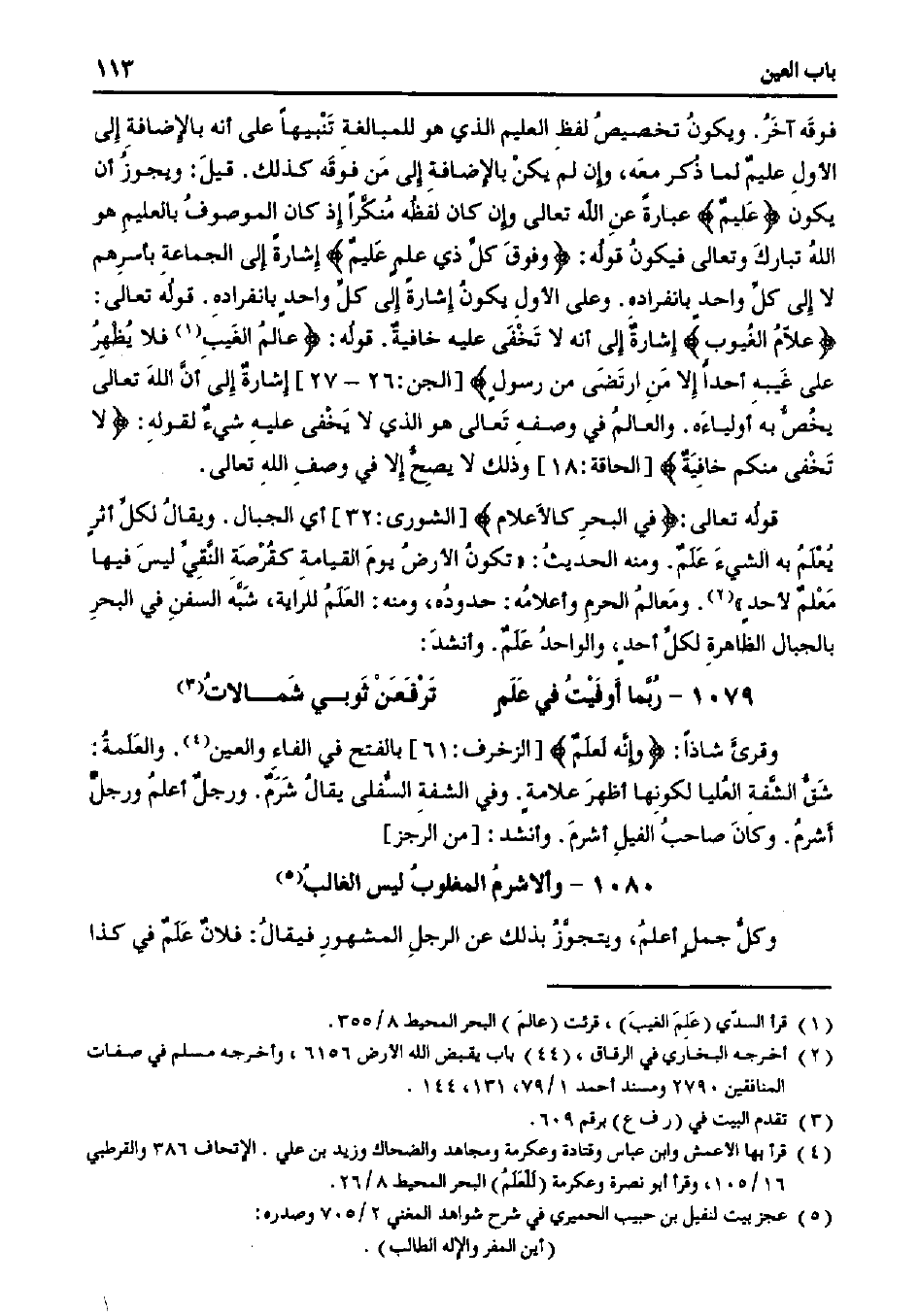 قوله تعالى: {في البحر كالأعلام} [الشورى:32] أي الجبال. ويقال لكل أثرٍ يعلم به الشيء علم. ومنه الحديث: «تكون الأرض يوم القيامة كقرصة النقي ليس فيها معلم لأحدٍ». ومعالم الحرم وأعلامه: حدوده، ومنه: العلم للراية، شبه السفن في البحر بالجبال الظاهرة لكل أحدٍ، والواحد علم. وأنشد:
