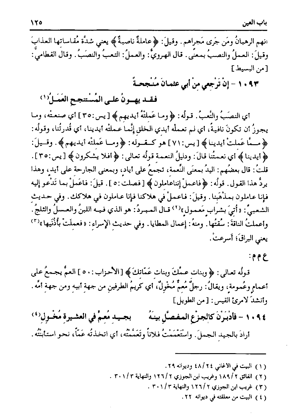 أي النصب والتعب. قوله: {وما عملته أيديهم} [يس:35] أي صنعته، وما يجوز أن تكون نافيةً، أي لم تعمله أيدي الخلق إنما عملته أيدينا، أي قدرتنا، وقوله: {مما عملت أيدينا} [يس:71] هو كقوله: {وما عملته أيديهم}. وقيل: {أيدينا} أي نعمتنا قال: ودليل النعمة قوله تعالى: {أفلا يشكرون} [يس:35]. قلت: قال بعضهم: اليد بمعنى النعمة، تجمع على أيادٍ، وبمعنى الجارحة على أيدٍ، وهذا يرد هذا القول. قوله: {فاعمل إننا عاملون} [فصلت:5]. قيل: فاعمل بما تدعوا إليه فإنا عاملون بمذهبنا. وقيل: فاعمل في هلاكنا فإنا عاملون في هلاكك. وفي حديث الشعبي: «أتي بشرابٍ معمولٍ» قال المبرد: هو الذي فيه اللبن والعسل والثلج. وأعملت الناقة: سقتها. ومنه: إعمال المطايا. وفي حديث الإسراء: «فعملت بأذنيها» يعني البراق؛ أسرعت.