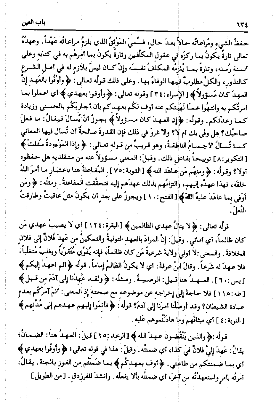 حفظ الشيء ومراعاته حالًا بعد حالٍ، فسمي الموثق الذي يلزم مراعاته عهدً. وعهده تعالى تارةً يكون بما ركزه في عقول المكلفين وتارةً يكون بما أمرهم به في كنابه وعلى ألسنة رسله، وتارةً بما يلزمه المكلف نفسه وإن كان ليس بلازم له في أصل الشرع كالندور، والكل مطلوب فيها الوفاء بها. وعلى ذلك قوله تعالى: {وأوفوا بالعهد إن العهد كان مسؤولًا} [الإسراء:34] وقوله تعالى: {وأوفوا بعهدي} أي اعملوا بما أمرتكم به وانتهوا عما نهيتكم عنه أوف لكم بعهدكم بأن أجازيكم بالحسنى وزيادة كما وعدتكم. وقوله: {إن العهد كان مسؤولًا} يجوز أن يسأل فيقال: ما فعل صاحبك؟ هل وفى بك أم لا؟ ولا غرو في ذلك فإن القدرة صالحة أن تسأل فيها المعاني كما تسأل الأجسام الناطقة، وهو قريب من قوله تعالى: {وإذا الموءودة سئلت} [التكوير:8] توبيخًا بفاعل ذلك. وقيل: المعنى مسوؤلًا عنه عن متقلديه هل حفظوه أو لا؟ وقوله: {ومنهم من عاهد الله} [النوبة:75]. المفاعلة هنا باعتبار ما أمر الله خلقه، فهذا عهده إليهم، والنزامهم بذلك عهدهم إليه فتحققت المفاعلة. ومثله: {ومن أوفى بما عاهد عليه الله} [الفتح:10] ويجوز على بعدٍ أن يكون مثل عاقبت وطارقت النعل.