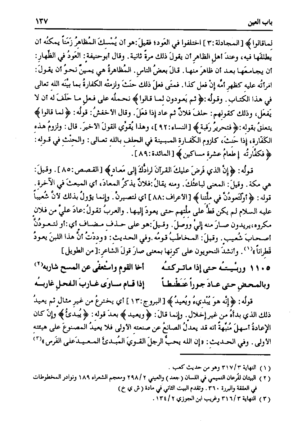 قوله: {إن الذي فرض عليك القرآن لرادك إلى معادٍ} [القصص:85]. وقيل: هي مكة. وقيل: المعنى لباعثك. ومنه يقال: فلان يذكر المعاد، أي المبعث في الآخرة. قوله: {أو لتعودن في ملتتنا} [الأعراف:88] أي لتصيرن. وإنما يؤول بذلك لأن شعيبًا عليه السلام لم يكن قط على ملتهم حتى يعود إليها. والعرب تقول: عاد على من فلان مكروه، يريدون صار منه إلى ووصل. وقيل: هو على حذف مضافٍ أي: أو لتعودن أصحاب شعيبٍ. وقيل: المخاطب قومه. وفي الحديث: «وددت أن هذا اللبن يعود قطرانًا». وأنشد النحويون على كونها بمعنى صار قول الشاعر: [من الطويل]