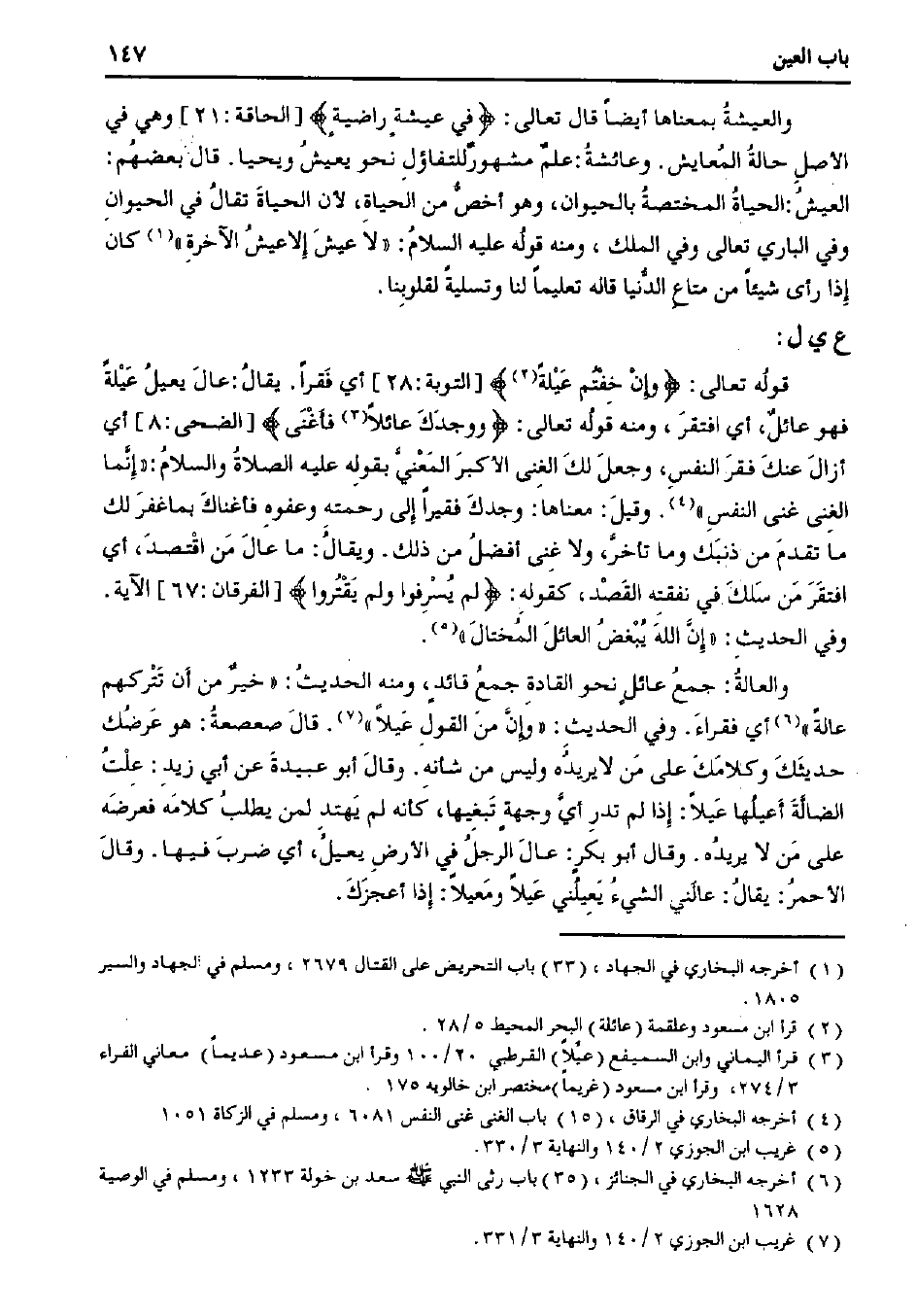 قوله تعالى: {وإن خفتم عيلةً} [التوبة:28] أي فقرأ. يقال: عال يعيل عيلةً فهو عائل، أي افتقر، ومنه قوله تعالى: {ووجدك عائلًا فأغنى} [الضحى:8] أي أزال عنك فقر النفس، وجعل لك الغنى الأكبر المعني بقوله عليه الصلاة والسلام: «إنما الغني غنى النفس». وقيل: معناها: وجدك فقيرًا إلى رجمته وعفوه فأغناك بما غفر لك ما تقدم من ذنبك وما تأخر، ولا غنى أفضل من ذلك. ويقال: ما عال من اقتصد، أي افتقر من سلك في نفقته القصد، كقوله: {لم يسرفوا ولم يقتروا} [الفرقان:67] الآية. وفي الحديث: «إن الله يبغض العائل المختال».