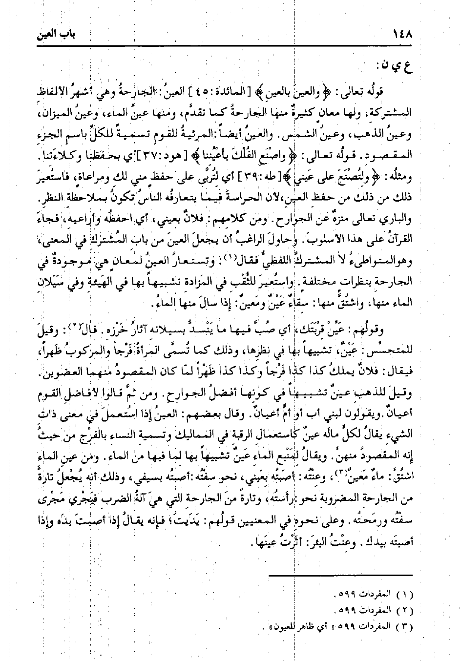 وقولهم: عين قربتك، أي صب فيها ما ينسد بسيلانه آثار خرزه. قال: وقيل للمتجسس: عين، تشبيهًا بها في نظرها، وذلك كما تسمى المرأة فرجًا والمركوب ظهرًا، فيقال: فلان يملك كذا كذا فرجًا وكذا كذا ظهرًا لما كان المقصود منهما العضوين. وقيل للذهب عين تشبيهًا في كونها أفضل الجوارح. ومن ثم قالوا لأفاضل القوم أعيان. ويقولون لبني أب أو أم أعيان. وقال بعضهم: العين إذا استعمل غي معنى ذات الشيء يقال لكل ماله عين كاستعمال الرقبة في المماليك وتسمية النساء بالفرج من حيث إنه المقصود منهمن. ويقال لمنبع عين تشبيهًا بها لما فيها من الماء. ومن عين الماء اشتق: ماء معين، وعنته: أصبته بعيني، نحو سفته: أصبته بسيفي، وذلك أنه يجعل تارةً من الجارحة المضروبة نحو: رأسته، وتارةً من الجارحة التي هي آلة الضرب فيجري مجرى سفته ورمحته. وعلى نحوه في المعنيين قولهم: يديت؛ فإنه يقال إذا أصبت يده وإذا أصبته بيدك. وعنت البئر: أثرت عينها.
