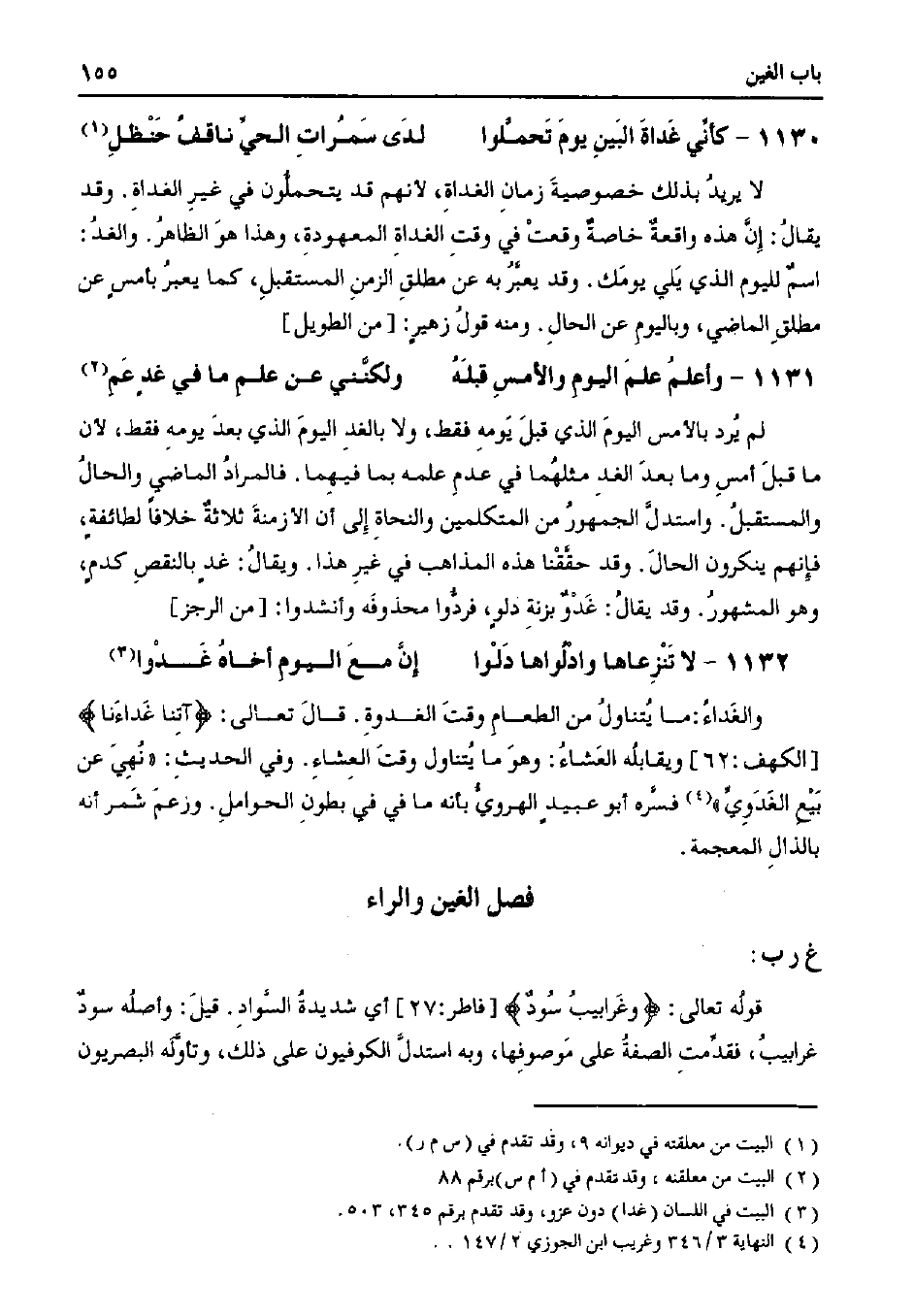 لم يرد بالأمس اليوم الذي قبل يومه فقط، ولا بالغد اليوم الذي بعد يومه فقط، لأن ما قبل أمس وما بعد الغد مثلهما في عدم علمه بما فيهما. فالمراد الماضي والحال والمستقبل. واستدل الجمهور من المتكلمين والنحاة إلى أن الأزمنة ثلاثة خلافًا لطائفة، فإنهم ينكرون الحال. وقد حققنا هذه المذاهب في غير هذا. ويقال: غدٍ بالنقص كدمٍ، وهو المشهور. وقد يقال: غدو بزنة دلوٍ، فردوا محذوفة وأنشدوا: [من الرجز]