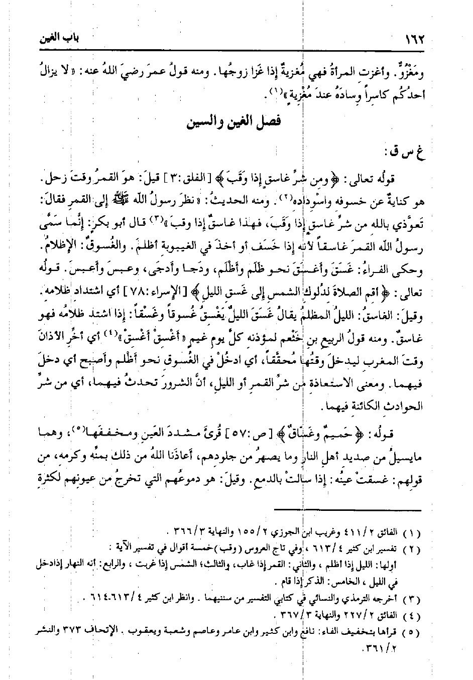 قوله تعالى: {ومن شر غاسق إذا وقب} [الفلق:3] قيل: هو القمر وقت زحل. هو كناية عن خسوفه واسوداده. ومنه الحديث: "نظر رسول الله صلى الله عليه وسلم إلى القمر قال: تعوذي بالله من شر غاسقٍ إذا وقب، فهذا غاسق إذا وقب" قال أبو بكر: إنما سمي رسول الله القمر غاسقًا لأنه إذا خسف أو أخذ في الغيبوبة أظلم. والغسوق: الإظلام. وحكي الفراء: غسق وأغسق نحو ظلم وأظلم، ودجا وأدجي، وعبس وأعبس. قوله تعالى: {أقم الصلاة لدلوك الشمس إلى غسق الليل} [الإسراء:78] أي اشتداد ظلامه.