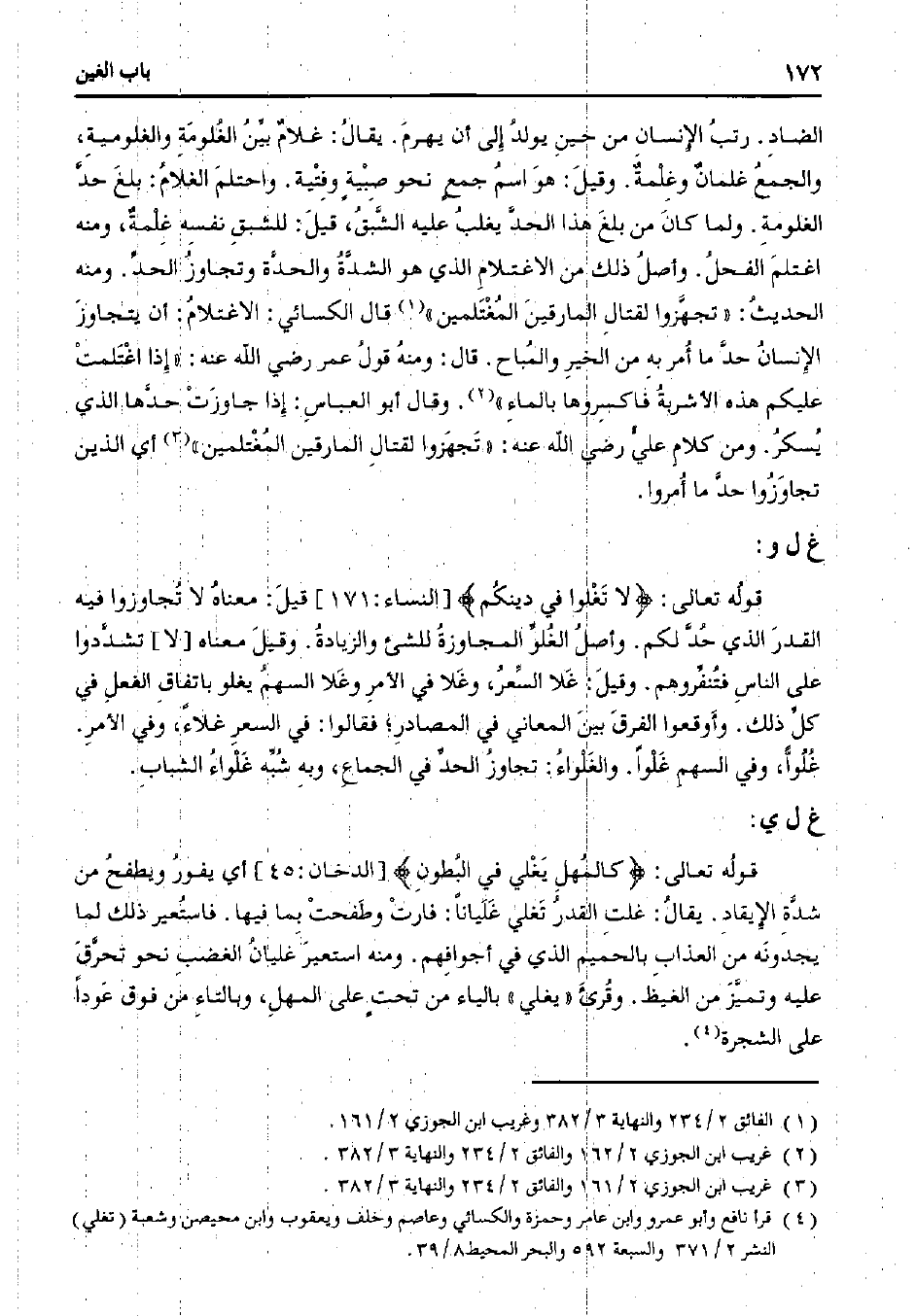 قوله تعالى: {لا تغلوا في دينكم} [النساء:171] قيل: معناه لا تجاوزوا فيه القدر الذي حد لكم. وأصل الغلو المجاوزة الشيء والزيادة. وقيل معناه [لا] تشددوا على الناس فتنفروهم. وقيل: غلا السعر، وغلا في الأمر وغلا السهم يغلو باتفاق الفعل في كل ذلك. وأوقعوا الفرق بين المعاني في المصادر؛ فقالوا: في السعر غلاء، وفي الأمر. غلوا، وفي السهم غلوا. والغلواء: تجاوز الحد في الجماع، وبه شبه غلواء الشباب.