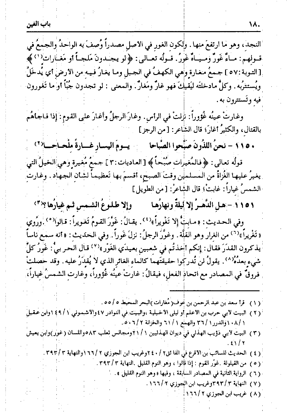وفي الحديث: "مابت لا تغويرًا". يُقال: غور القوم تغويرًا: قالوا. وروي "تغريرًا" من الغرار وهو القلة. وغور الرجل: نزل غورًا. وفي الحديث: "أنه سمع ناسًا يذكرون القدر فقال: إنكم أخذتم في شعبين بعيدي الغور" قال الحربي: غور كل شيء بُعده. يقول لن تدركوا حقيقتها كالماء الغائر الذي لا يُقدر عليه. وقد حصلت فروق في المصادر مع اتحاد الفعل، فيقال: غرت عينه غؤورًا، وغرات الشمس غيارًا،