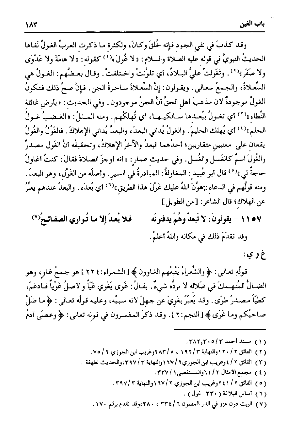 وقد كذب في نفي الوجود فإنه خُلق وكان، ولكثرة ما ذكرت العرب الغول نفاها الحديث النبوي في قوله عليه الصلاة والسلام: "لا غُول" كقوله: "لا همامة ولا عدوى ولا صفر". وتغولت على البلاد، أي تلونت واختلفت. وقال بعضهم: الغول هي السعلاة، والجمع سعالى. ويقولون: إن السعلاة ساحرة الجن. فإن صح ذلك فتكون الغول موجودة لأن مذهب أهل الحق أن الجن موجودون. وفي الحديث: "بأرض غائلة النطاء" أي تغول ببعدها سالكيها، أي تهلكهم. ومنه المثل: "الغضب غول الحلم" أي يُهلك الحليم. والغول يداني البعد، والعبد يداني الإهلاك. فالغول والغول يقعان على معنيين متقاربين؛ أحدهما البعد والآخر الإهلاك، وتحقيقه أن الغول مصدر والغول اسم كالغسل والغسل. وفي حديث عمار: "أنه أوجز الصلاة فقال: كنت أغاول حاجة لي" قال أبو عبيدٍ: المغاولة: المبادرة في السير: وأصله في الغول، وهو البعد. ومنه قولهم في الدعاء: "هون الله عليك غول هذا الطريق" أي بعده. والبعد عندهم يُعبر عن الهلاك؛ قال الشاعر: [من الطويل]