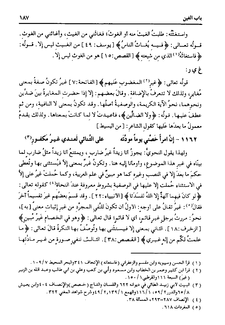قوله تعالى: {غير المغضوب عليهم} [الفاتحة: 7] غير تكون صفة بمعنى مُغاير، ولذلك لا تتعر فبالإضافة. وقال بعضهم: إلا إذا حضرت المغايرة بين ضدين ونحوهما، نحو الآية الكريمة، والوصفية أصلها. وقد تكون بمعنى لا النافية، ومن ثم عطف عليها. قوله: {ولا الضالين}، فأعيدت لا لما كانت بمعناها. ولذلك يقدم معمول ما بعدها عليها كقول الشاعر: [من البسيط]
