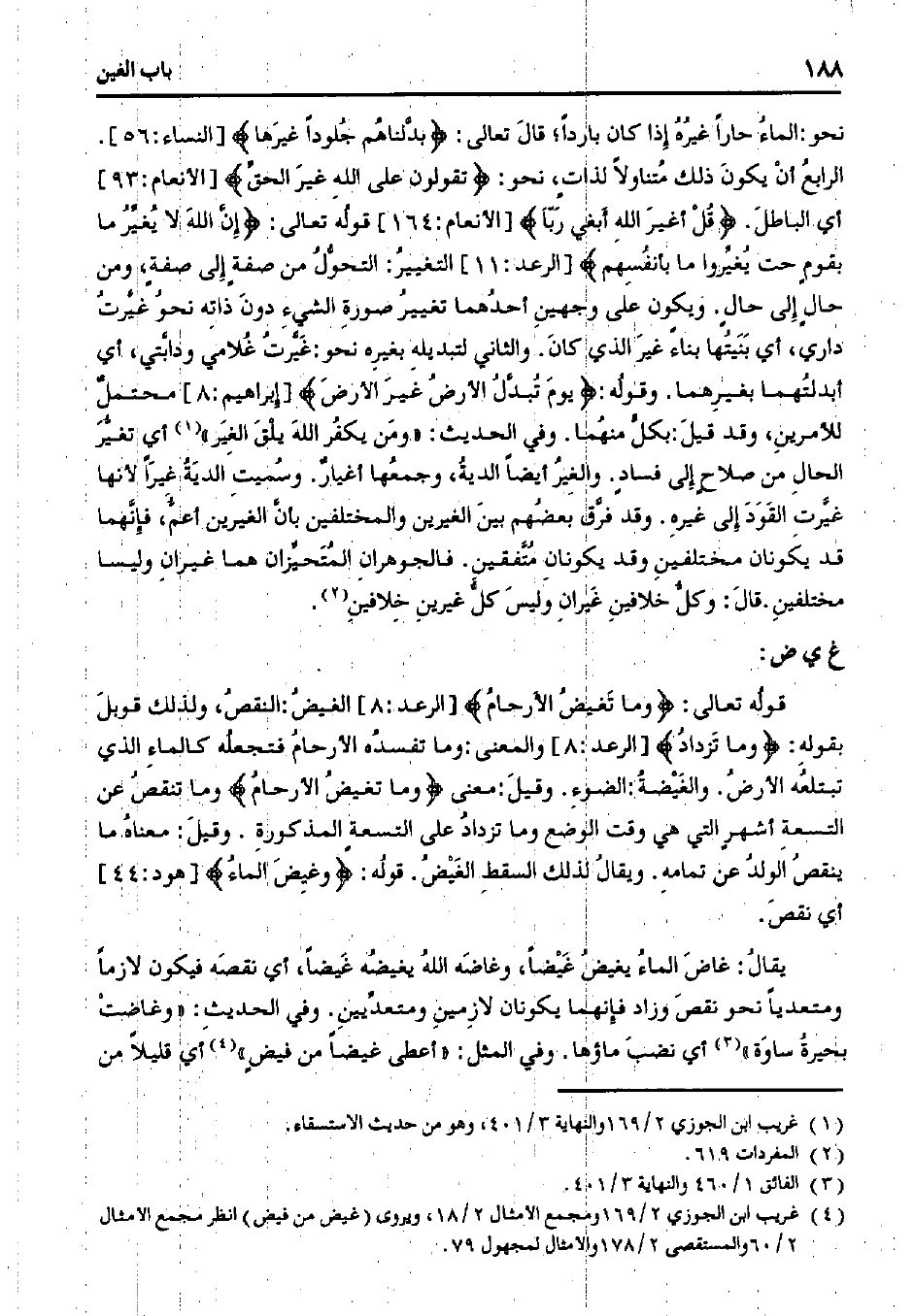 نحو: الماء حاراً غيره إذا كان باردًا؛ قال تعالى: {بدلناهم جلودًا غيرها {[النساء: 56]. الرابع أن يكون ذلك متناولًا لذات، نحو: {تقولون على الله غير الحق} [الأنعام: 93] أي الباطل. {أغير الله أبغي ربًا} [الأنعام: 164] قوله تعالى: {إن الله لا يغير ما بقوم حتى يغيروا ما بأنفسهم} [الرعد: 11] التغيير: التحول من صفة إلى صفة، ومن حال إلى حالٍ. ويكون على وجهين أحدهما تغيير صورة الشيء دون ذاته نحو غيرت داري، أي بنيتها بناءً غير الذي كان. والثاني بتبديله بغيره نحو: غيرت غلامي ودابتي، أي أبدلتهما بغيرهما. وقوله: {يوم تبدل الأرض غير الأرض} [إبراهيم: 8] محتمل للأمرين، وقد قيل: بكل منهما. وفي الحديث: "ومن يكفر الله يلق الغير" أي تغيير الحال من صلاح إلى فساد. والغير أيضًا الدية، وجمعها أغيار. وسميت الدية غيرًا لأنها غيرت القود إلى غيره. وقد فرق بعضهم بين الغيرين والمختلفين بأن الغيرين أعم، فإنهما قد يكونا مختلفين وقد يكونان متفقين. فالجوهران المتحيزان هما غيران وليسا مختلفين. قال: وكل خلافين غيران وليس كل غيرين خلافين.
