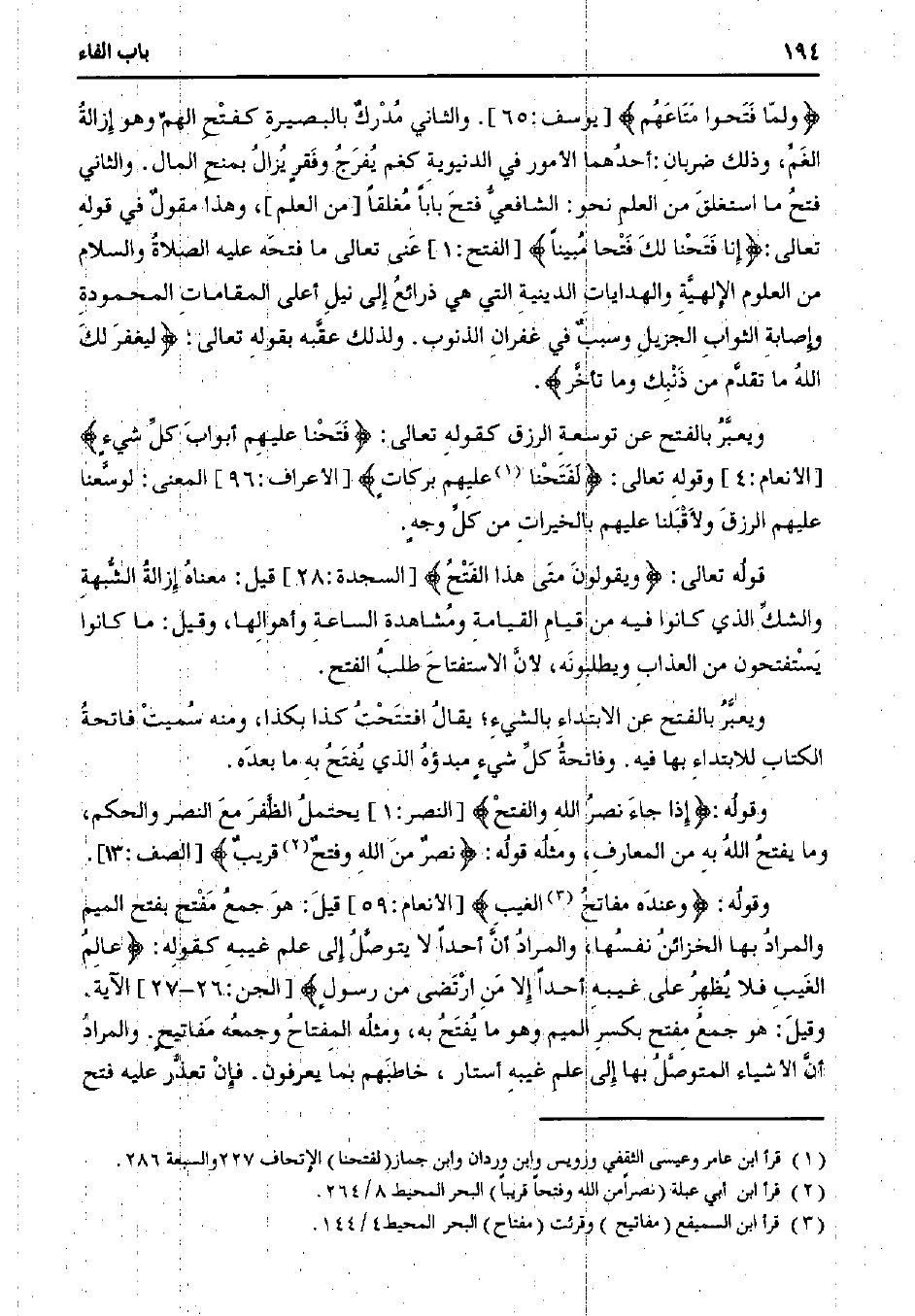 {ولما فتحوا متاعهم}] يوسف:65 [. والثاني مدرك بالبصيرة كفتح الهم وهو إزالة الغم، وذلك ضربان: أحدهما الأمور في الدنيوية كغم يفرج وفقر يزال بمنح المال. والثاني فتح ما استغلق من العلم نحو: الشافعي فتح باباً مغلقاً] من العلم [، وهذا مقول في قوله تعالى:} إنا فتحنا لك فتحا مبينًا {] الفتح:1 [عنى تعالى ما فتحه عليه الصلاة والسلام من العلوم الإلهية والهدايات الدينية التي هي ذرائع إلى نيل أعلى المقامات المحمودة وإصابة الثواب الجزيل وسبب في غفران الذنوب. ولذلك عقبه بقوله تعالى:} ليغفر لك الله ما تقدم من ذنبك وما تأخر {.