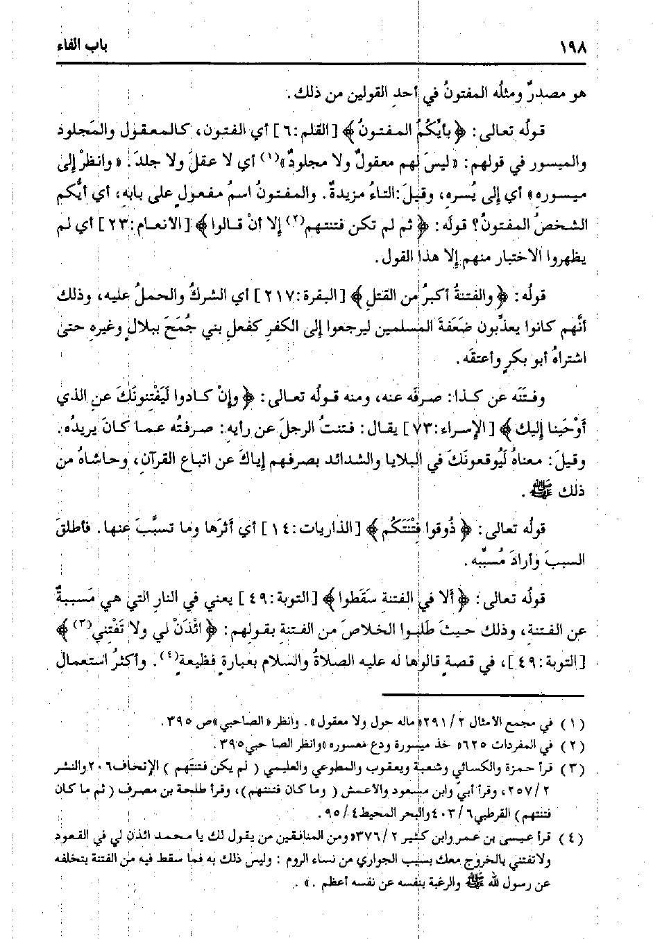 قوله تعالى:} بأيكم المفتون {] القلم:6 [أي الفتون، كالمعقول والمجلود والميسور في قولهم: "ليس لهم معقول ولا مجلود" أي لا عقل ولا جلد. "وانظر إلى ميسوره" أي إلى يسره، وقيل: التاء مزيدة. والمفتون اسم مفعول على بابه، أي أيكم الشخص المفتون؟ قوله:} ثم لم تكن فتنتهم إلا أن قالوا {] الأنعام:23 [أي لم يظهروا الاختبار منهم إلا هذا القول.